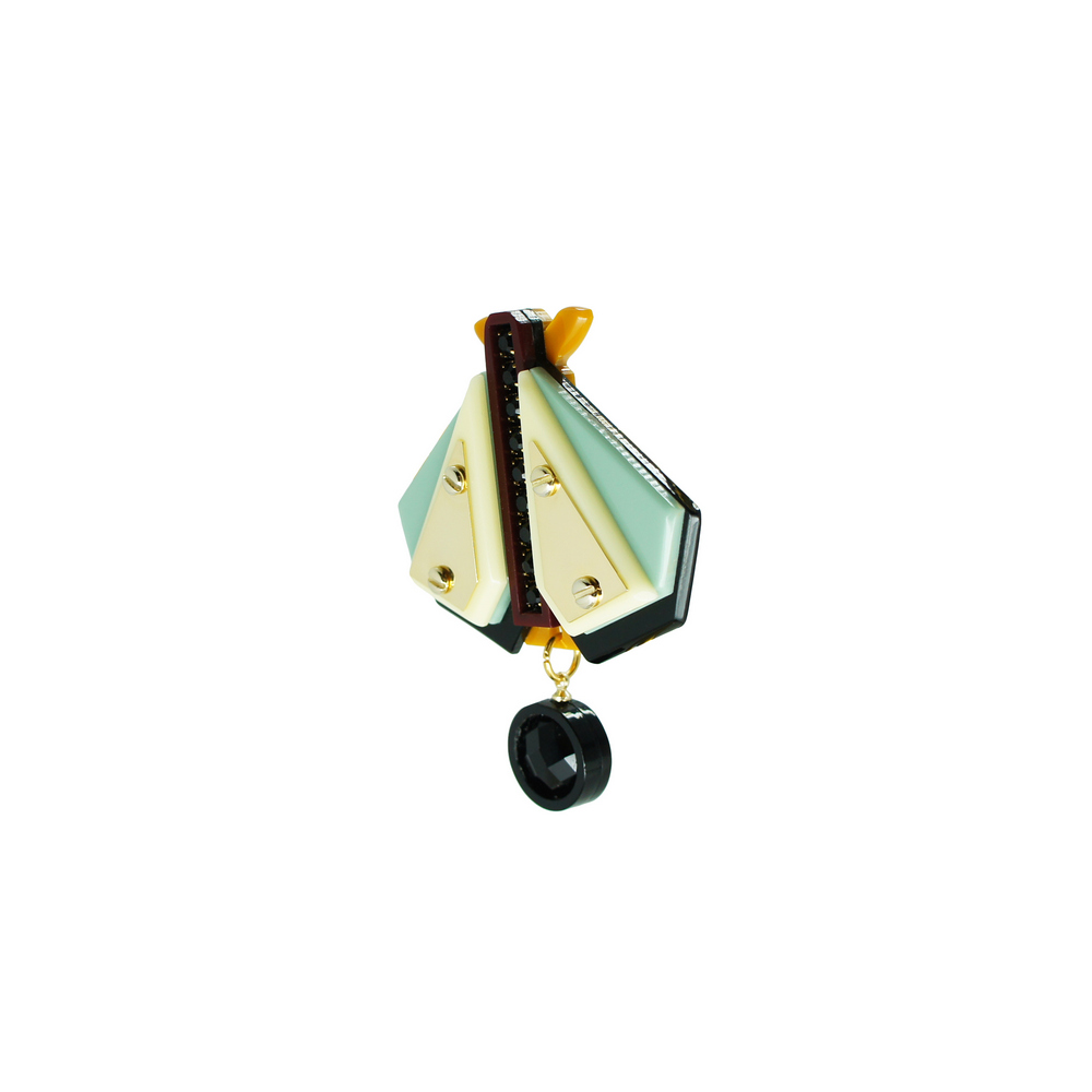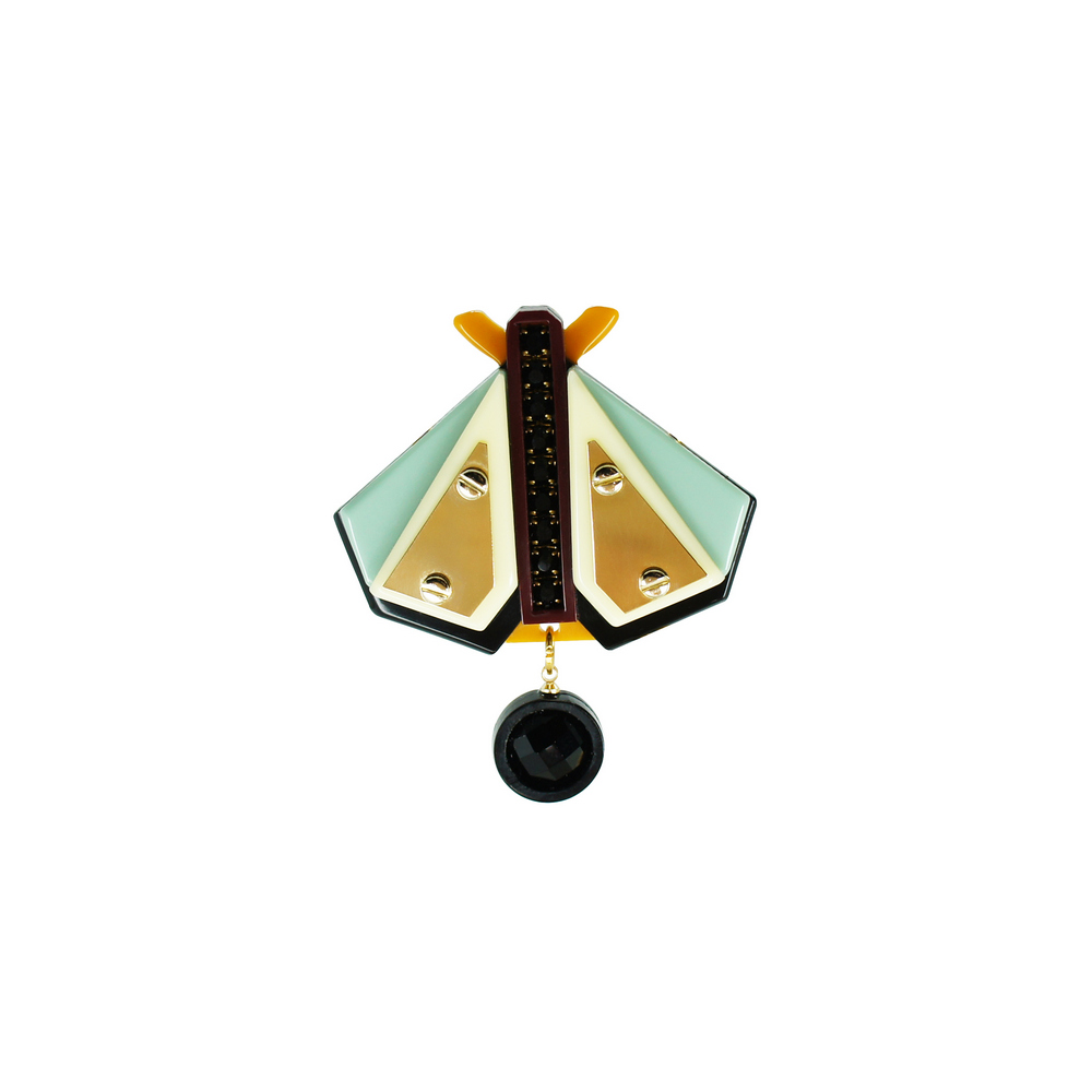 Broche de acrílico, com alfinete de fixação, aplicação de pedra de vidro, strass de vidro, aplicação de detalhe em metal dourado, metais com acabamento dourado. Feito a mão por artesãos brasileiros.