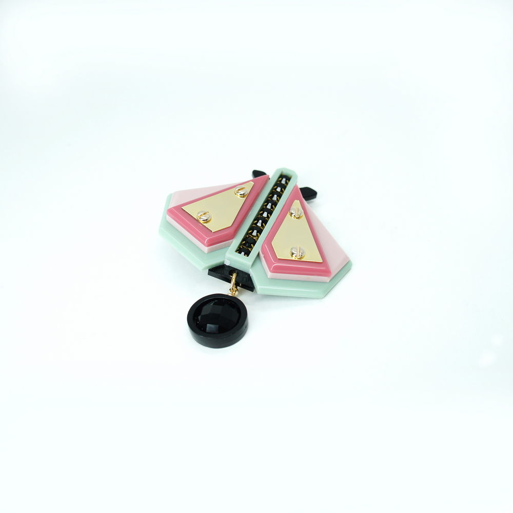 Broche de acrílico, com alfinete de fixação, aplicação de pedra de vidro, strass de vidro, aplicação de detalhe em metal dourado, metais com acabamento dourado. Feito a mão por artesãos brasileiros.