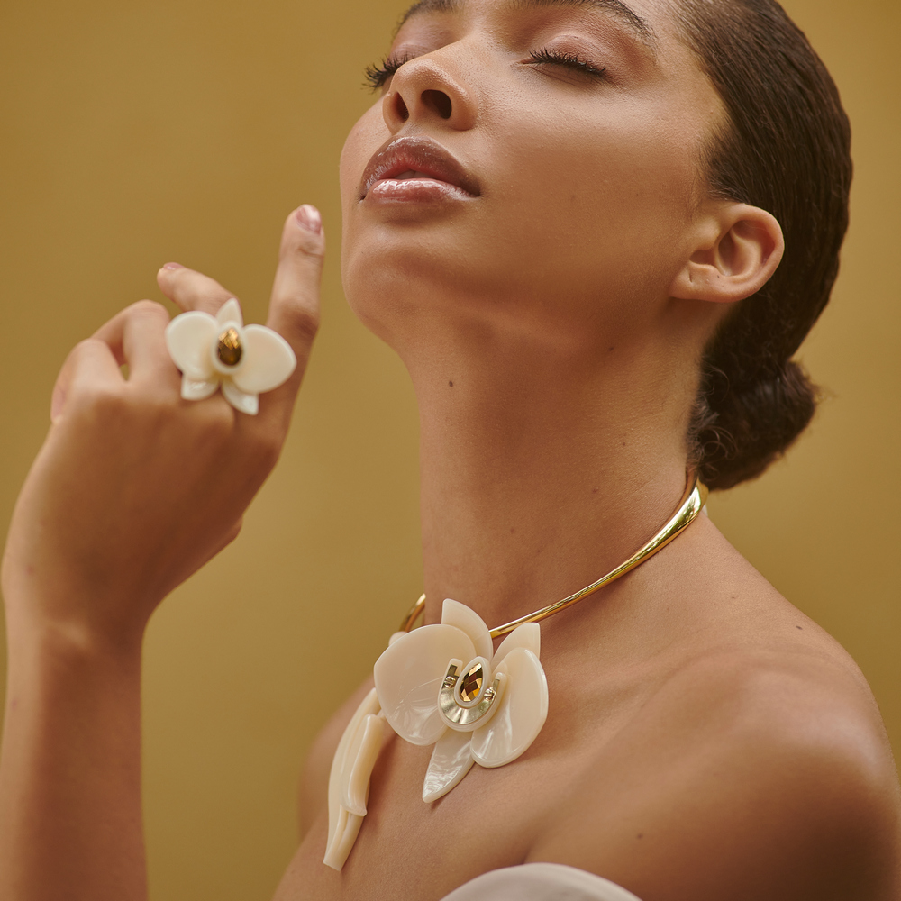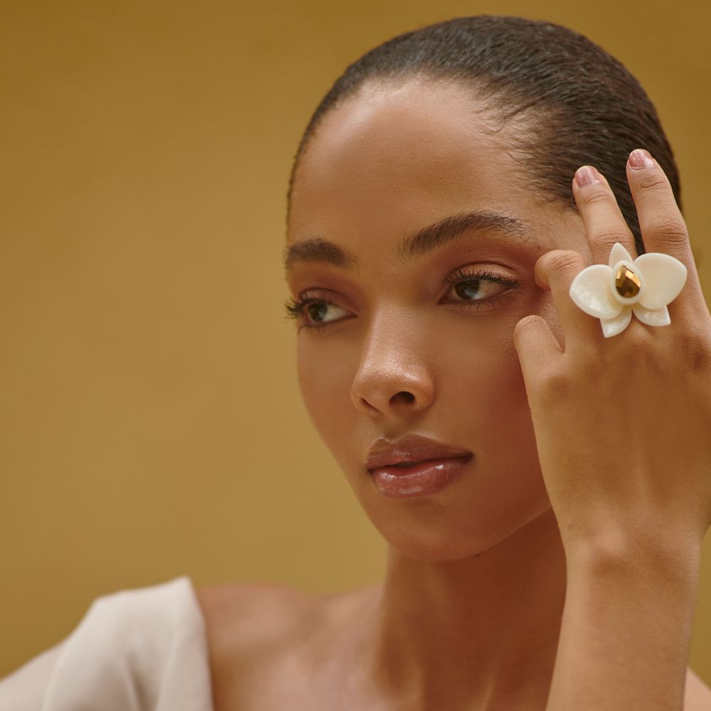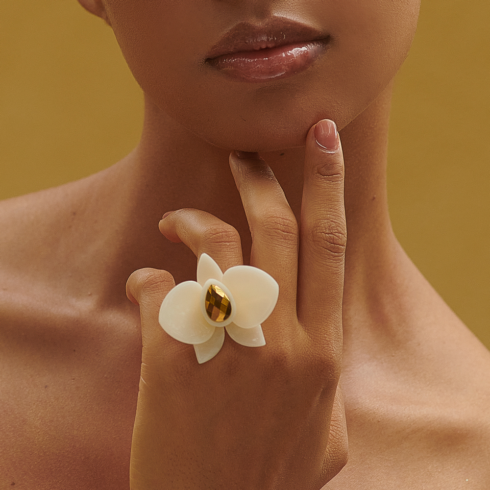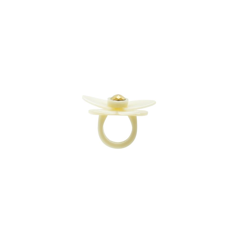Anel feito de acrílico, com aplicação de pedra de vidro espelhada. Feito a mão por artesãos brasileiros.