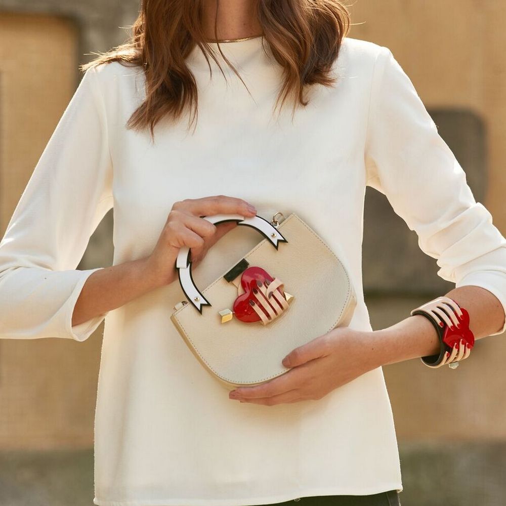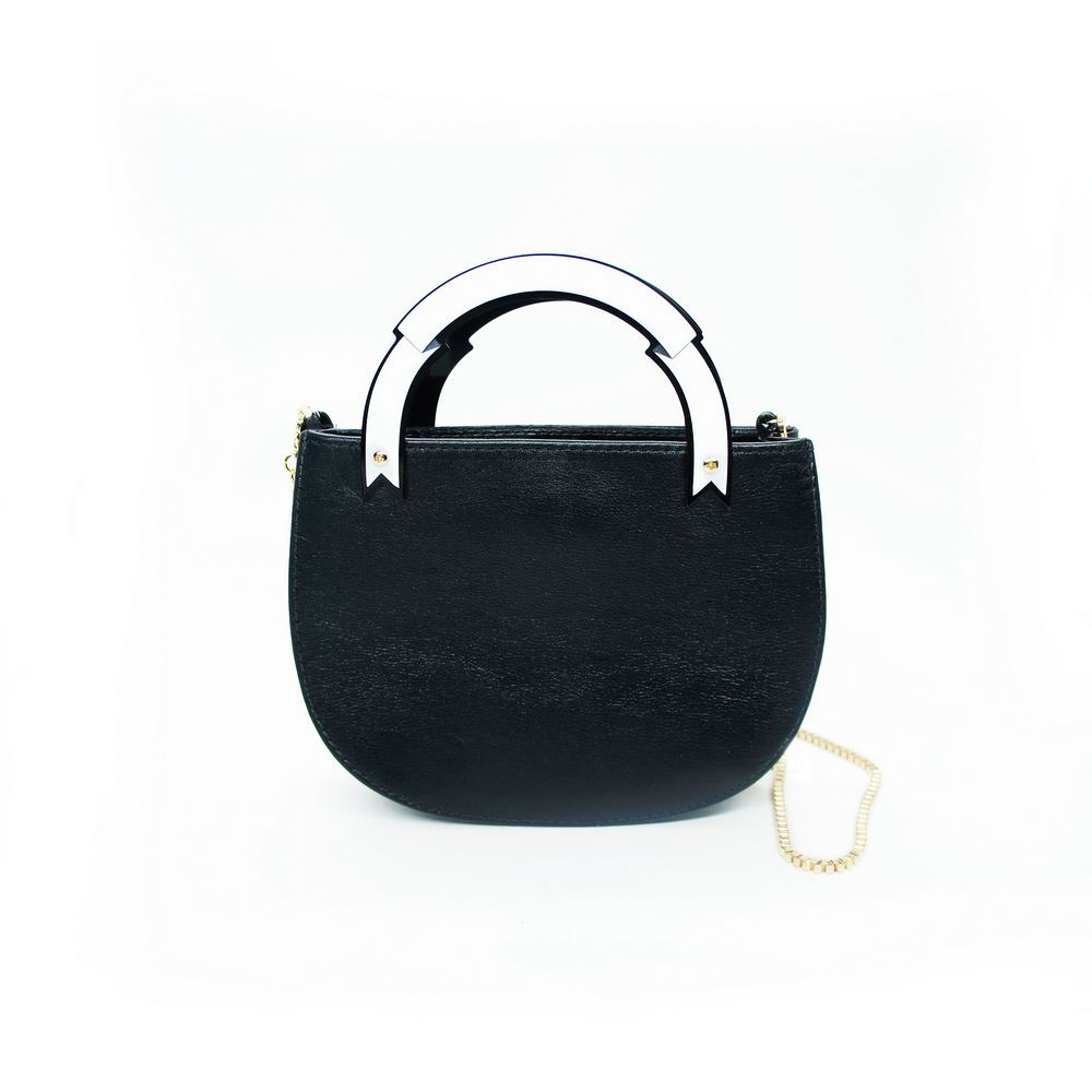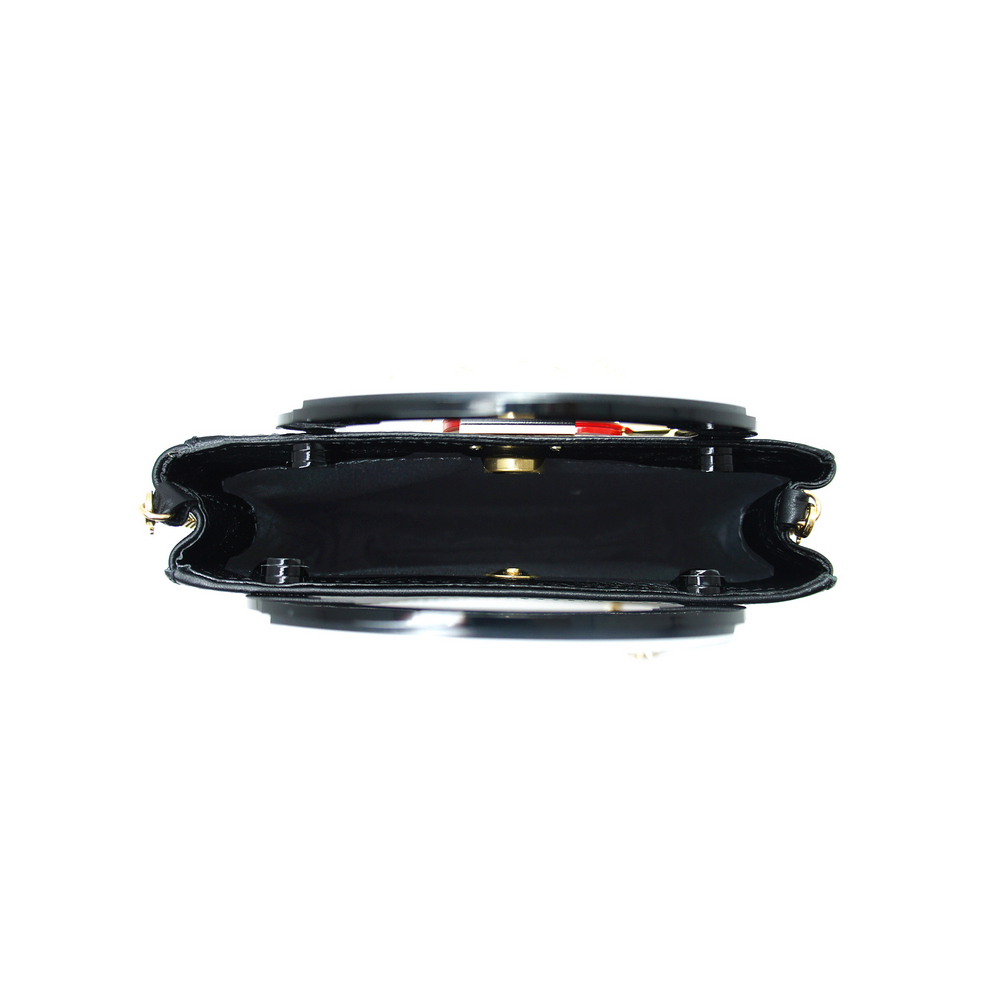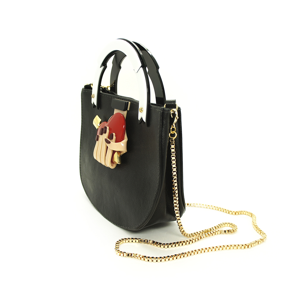 Bolsa de couro, com forro, com aplicação de acrílico, alça acrílica fixa e alça de corrente removível, metais com acabamento dourado.