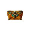 Clutch Demy, caixa e aplicações feitas de acrílico, combinado com aplicação de fórmica cerejeira, pedra de vidro, corrente, alça em corrente, metais com acabamento dourado. Feito à mão por artesãos brasileiros.