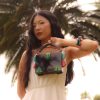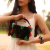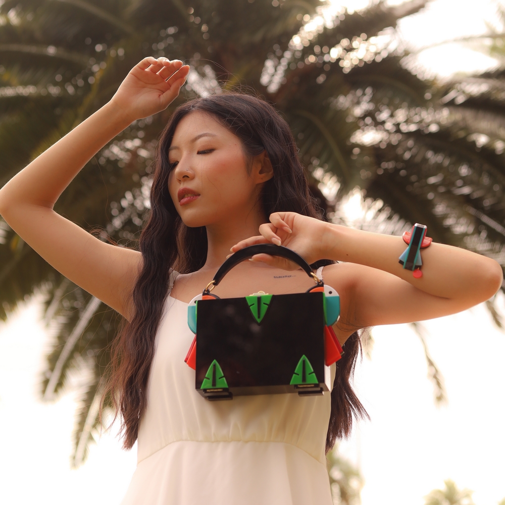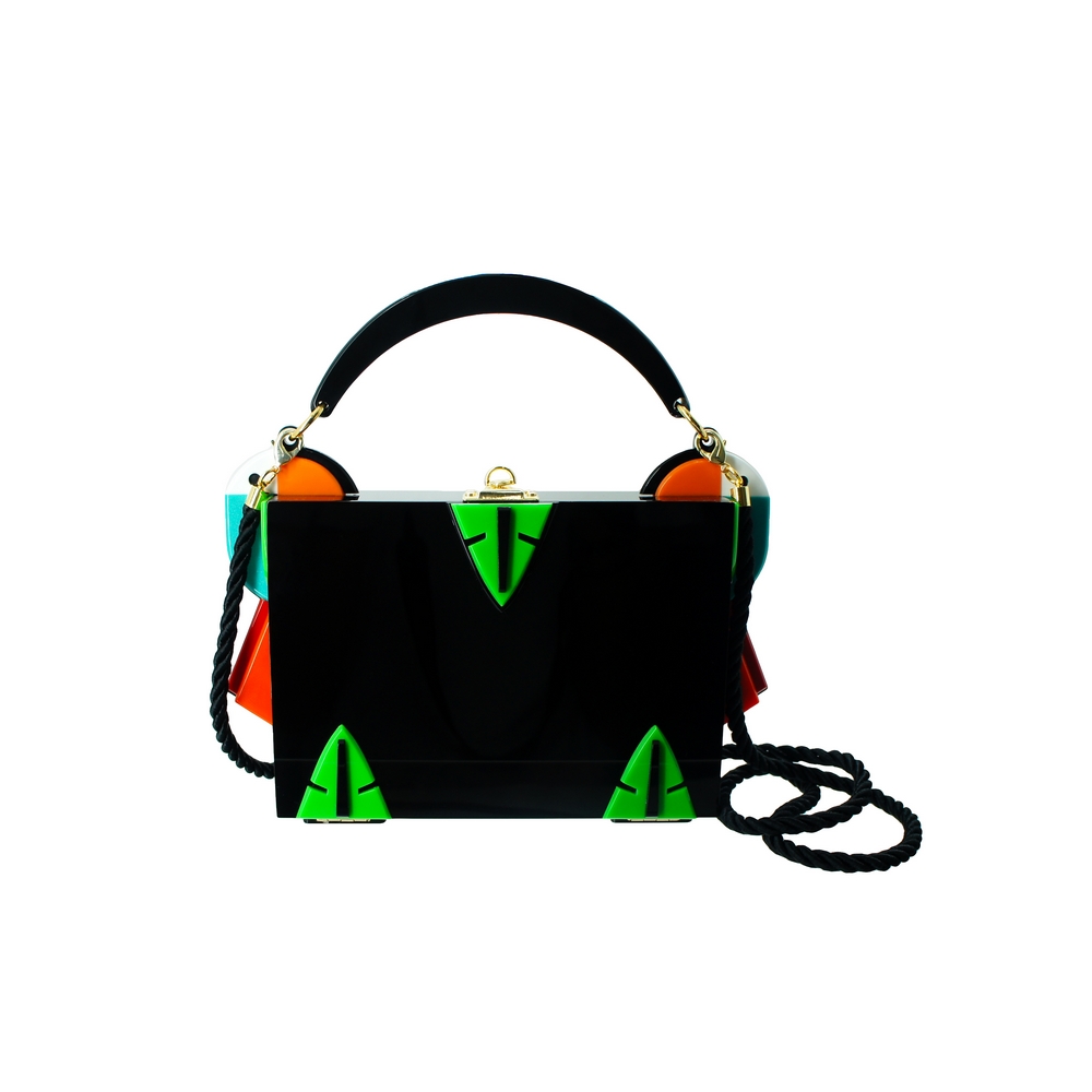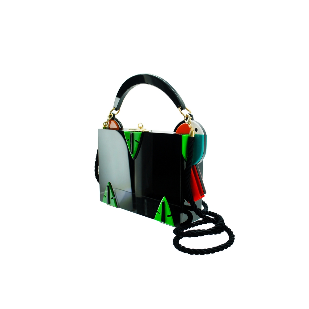 Clutch feita de acrílico, com alça de acrílico fixa e alça de cordão de algodão removível, fechamento por fecho, com forro interno em tercido de algodão, metais com acabamento dourado. Feito a mão por artesãos brasileiros.