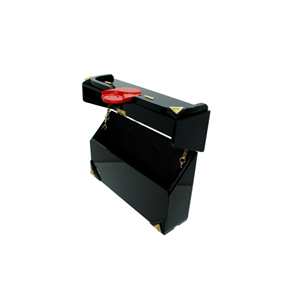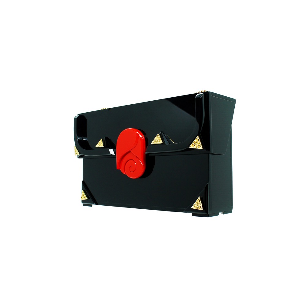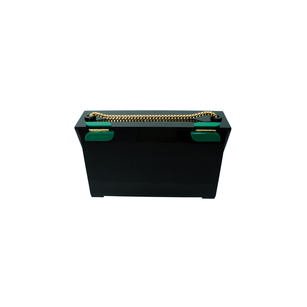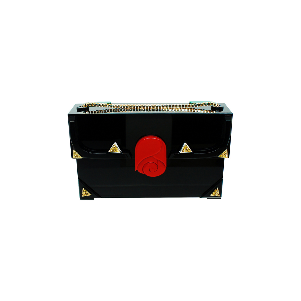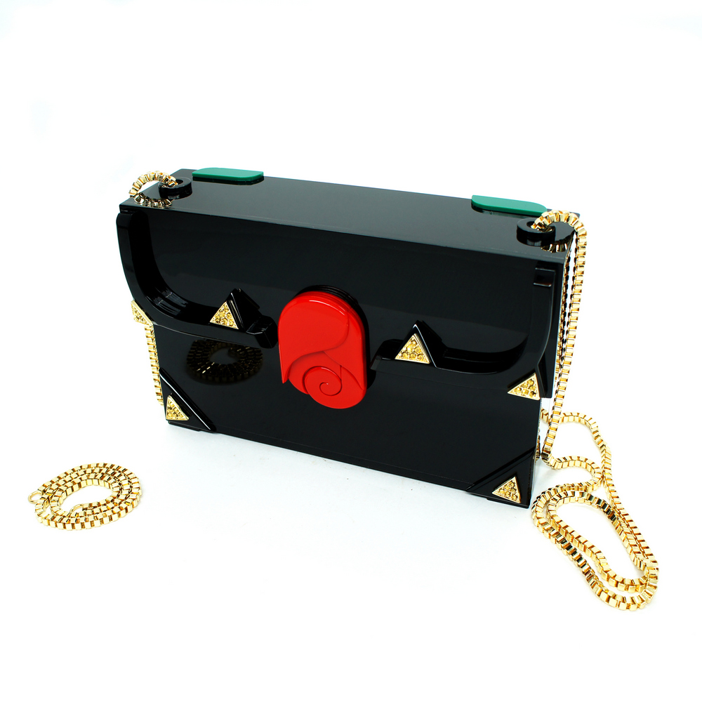 Clutch acrílico, com aplicação de enfeites de metal. O modelo vem com duas alças removíveis – curta e longa – que podem ser trocadas por dentro e fixadas com fechos lagosta. Metais com acabamento dourado. Feito à mão por artesãos brasileiros.