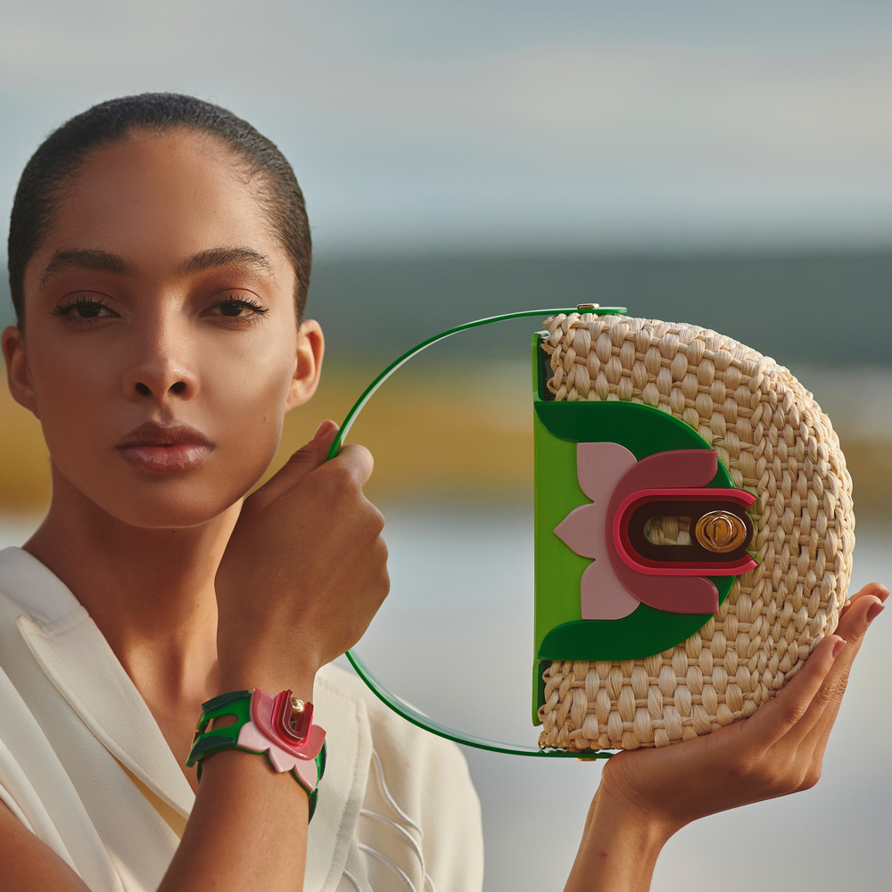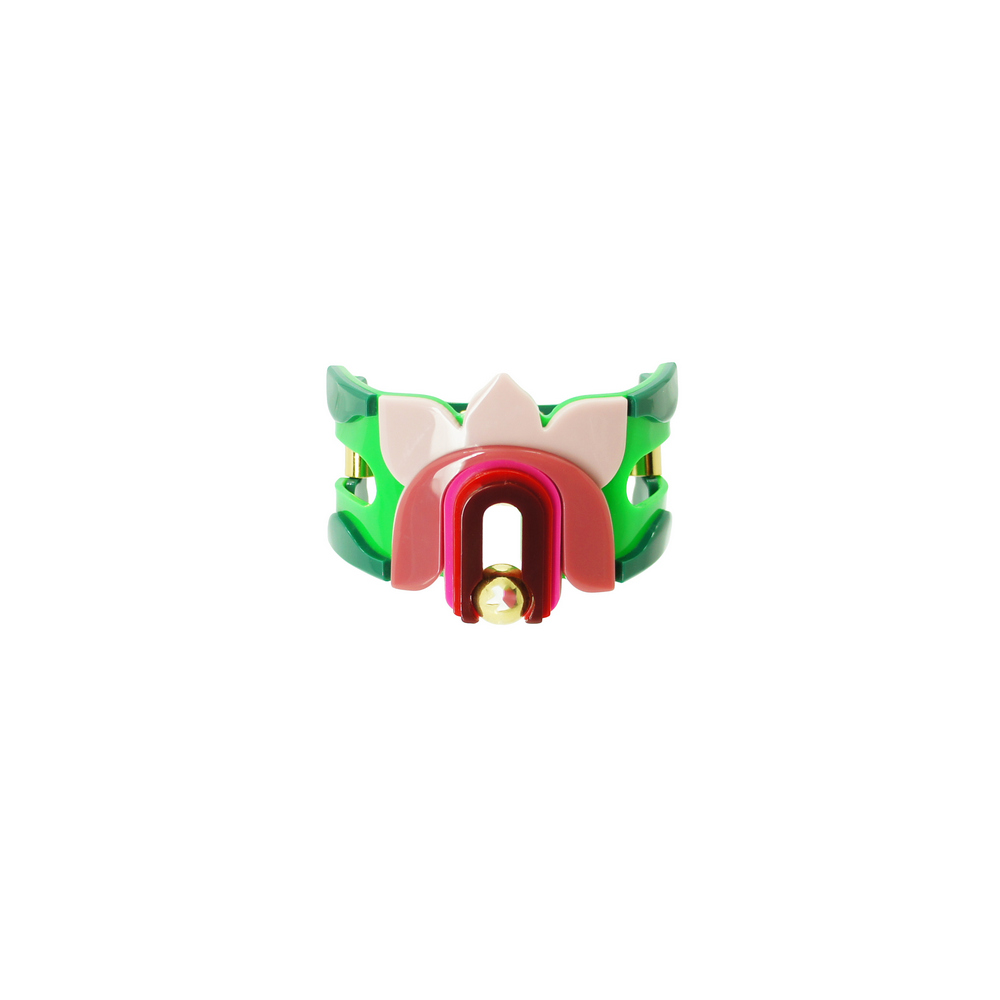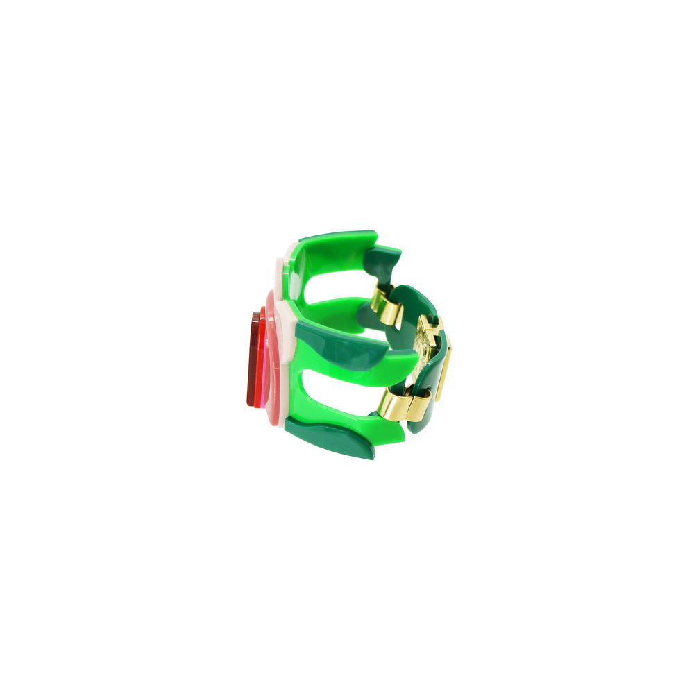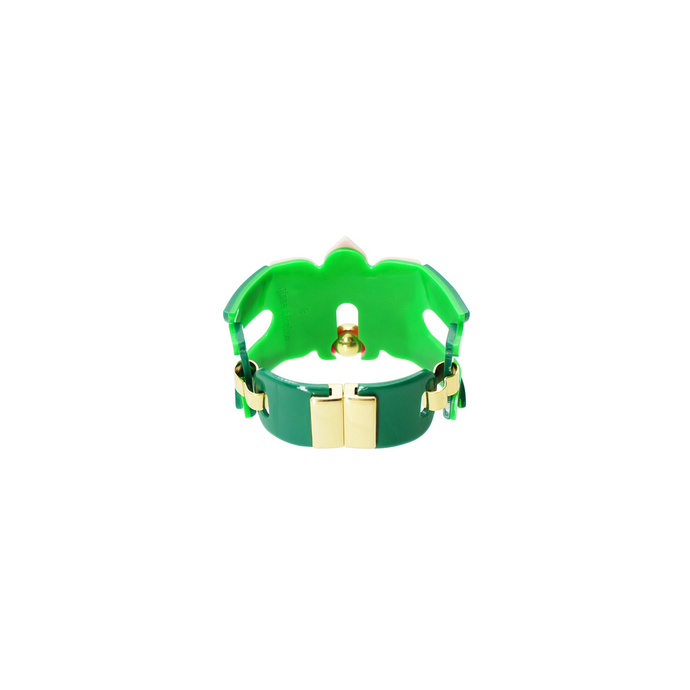 Bracelete feito de acrílico, modelo articulado, com conta de ABS, peças de Zamak e metais com acabamento dourado, com fecho imã. Feito a mão por artesãos brasileiros.