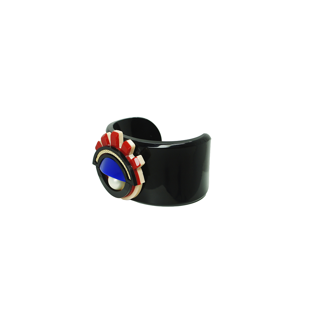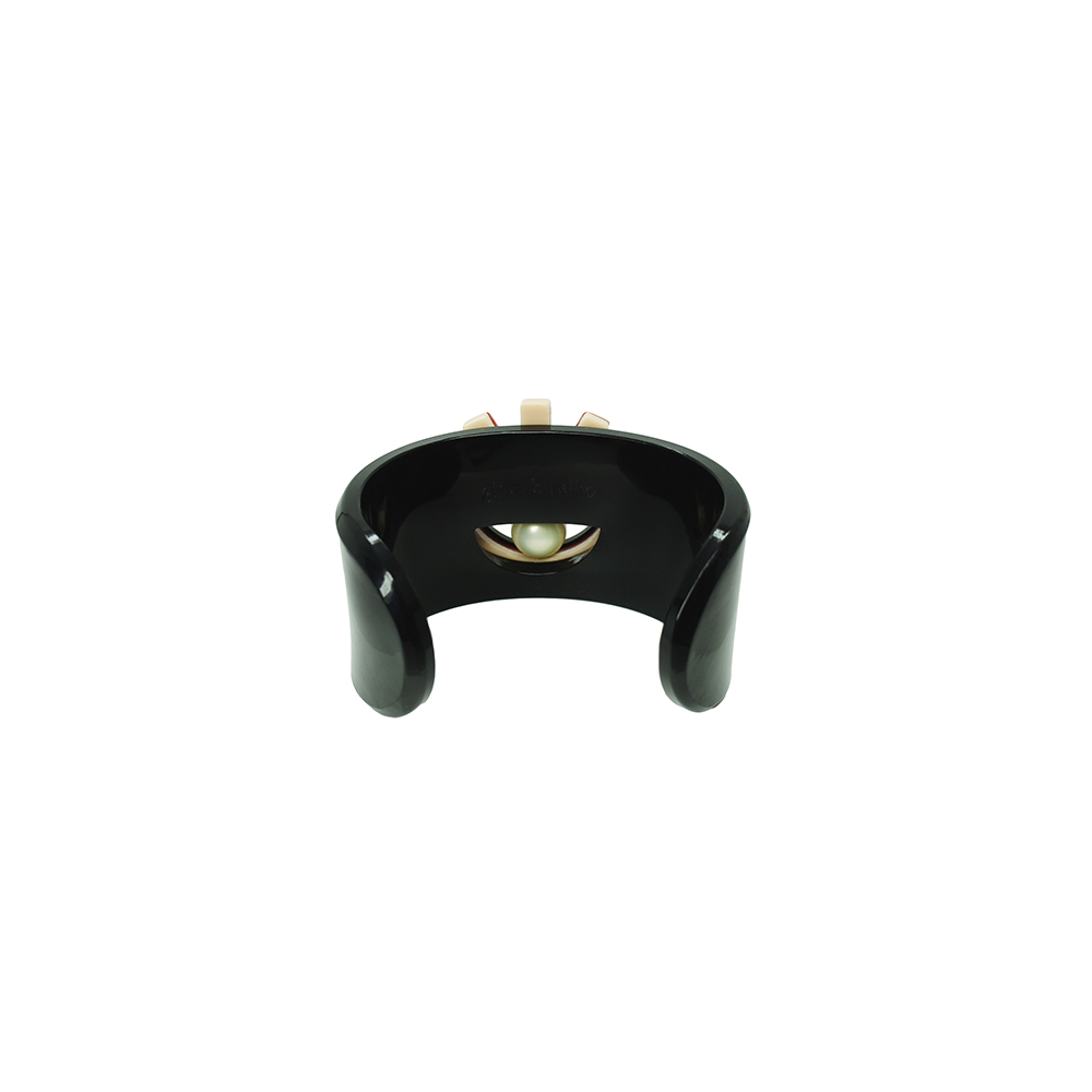 Bracelete de acrílico, feita à mão, modelo punho, com concha perolada, aplicação de corrente e metal com acabamento dourado.