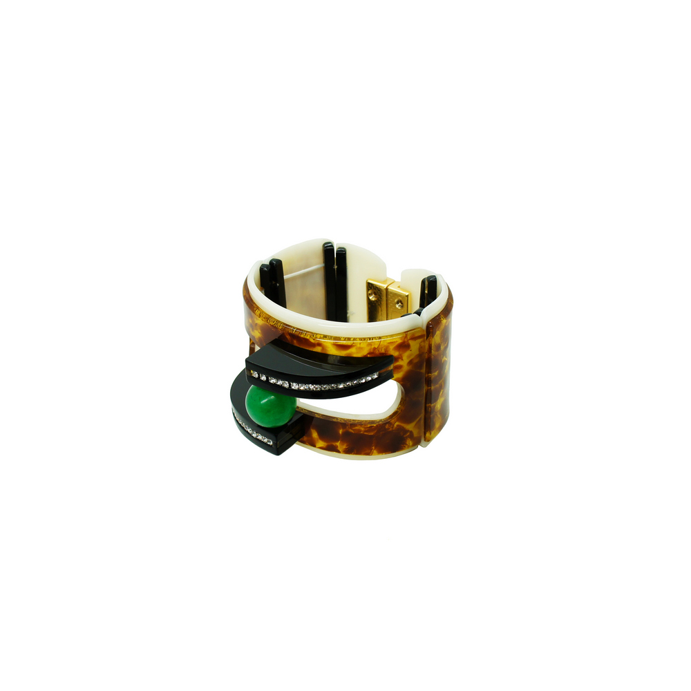 Pulseira de acrílico, modelo cuff, com aplicação de strass de vidro e conta Quartzo Rosa, Jade Verde tingida ou Sodalita, metais com acabamento dourado. Feito à mão por artesãos brasileiros.