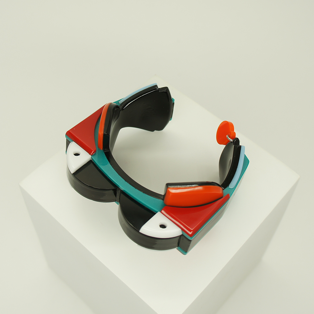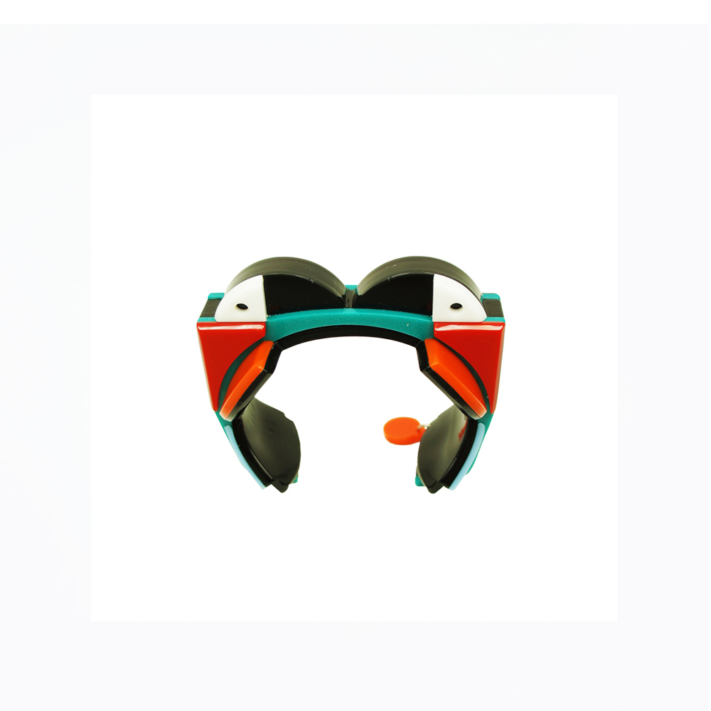 Bracelete Pássaro, feito de acrílico, modelo cuf. Feito à mão por artesãos brasileiros.