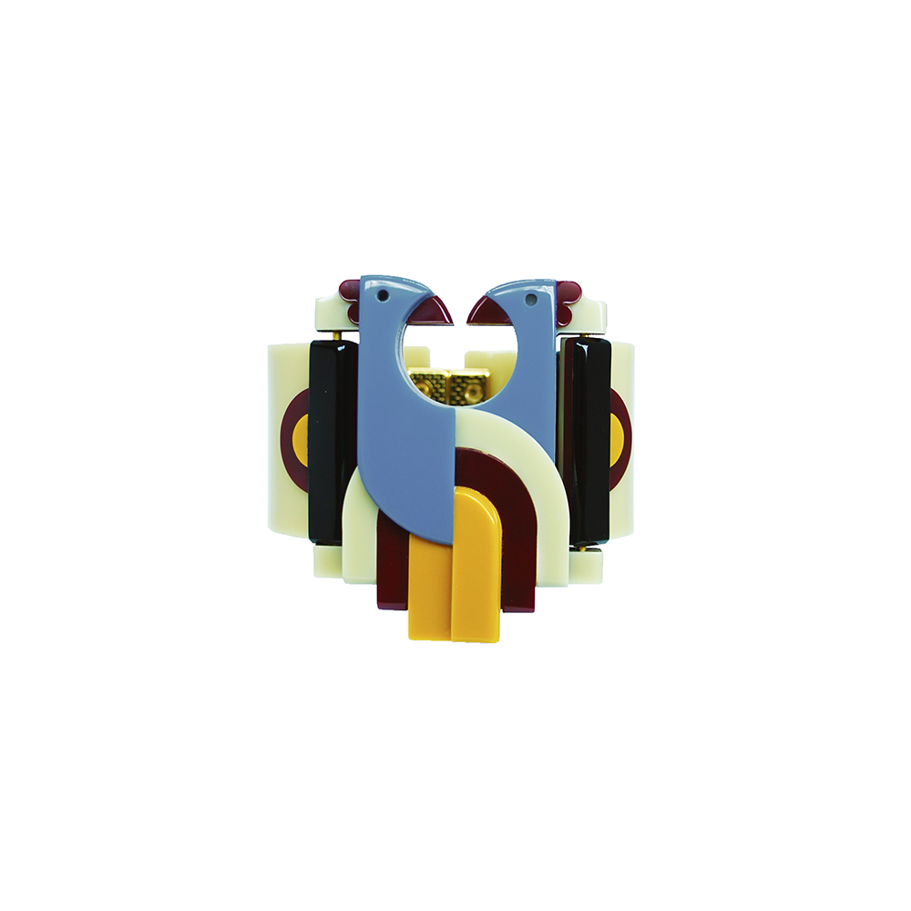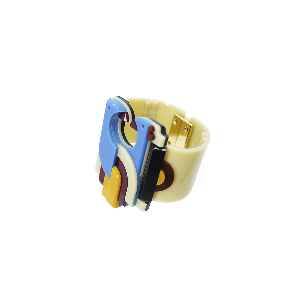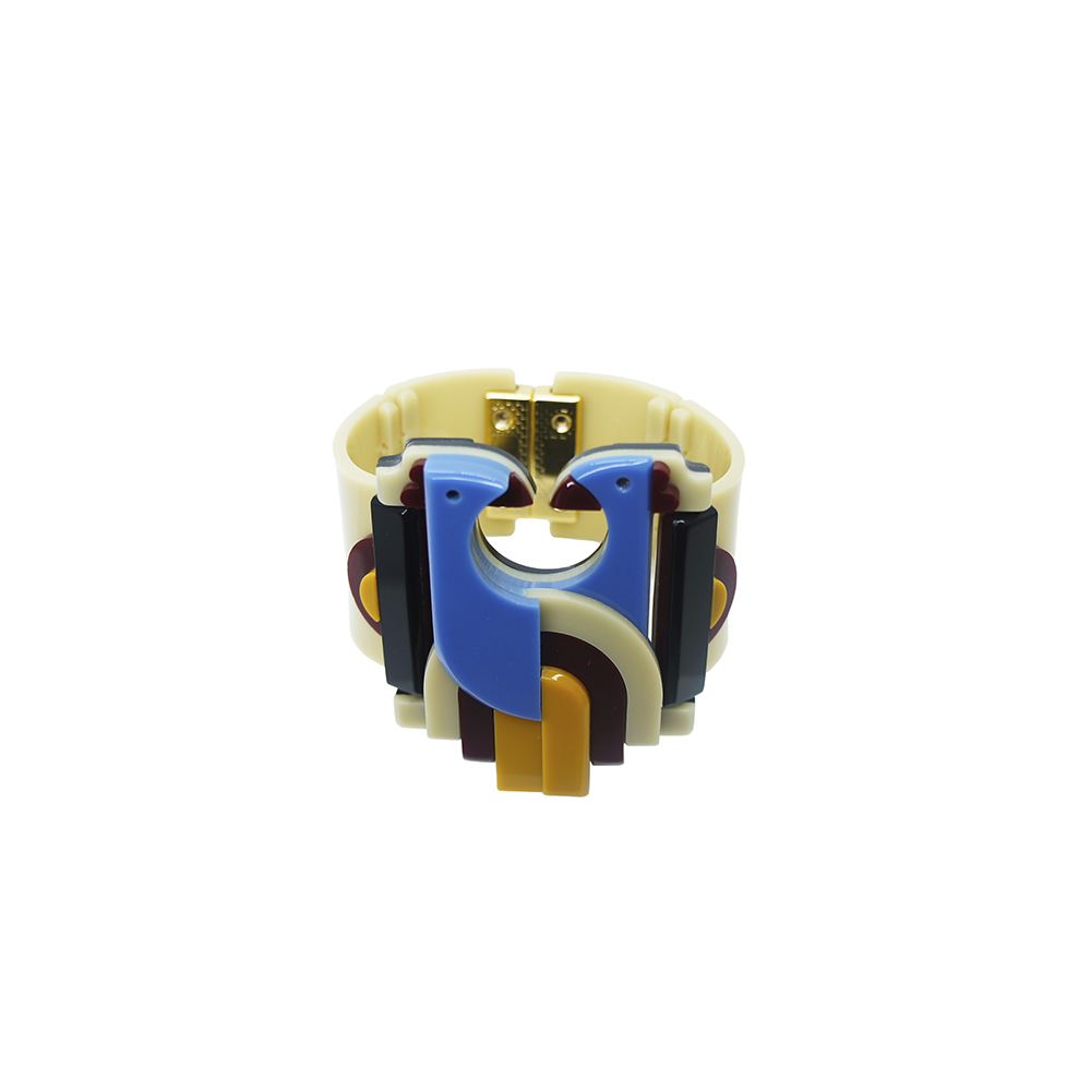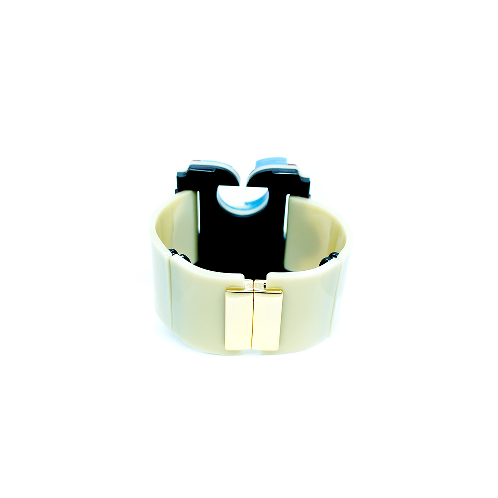 Bracelete de acrílico, artesanal, articulado, com fecho magnético, metais com acabamento dourado.