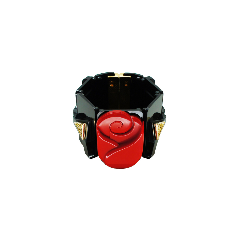 Bracelete de acrílico, modelo articulado, com aplicação de ornamento metálico, fechamento com fecho magnético. Metais com acabamento dourado. Feito à mão por artesãos brasileiros.