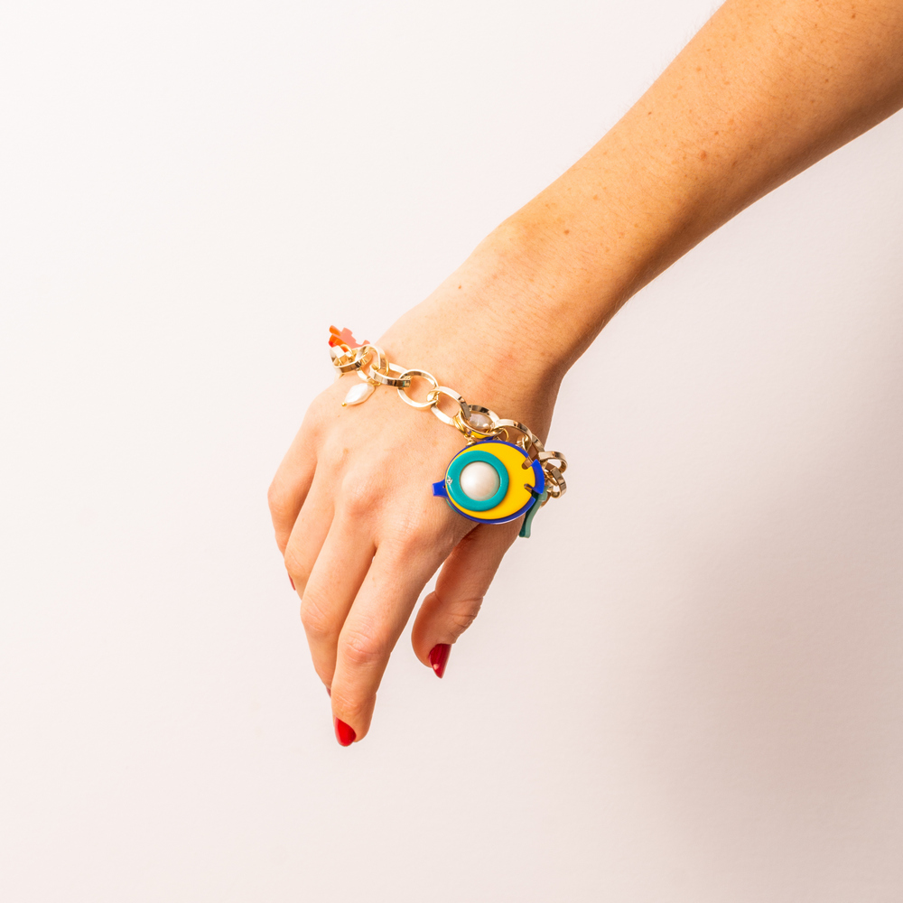Pulseira com berloques feita de acrílico e corrente, fechamento por fecho ‘T’, pingente de peixe com aplicação de pérola shell, com conta de pedra natural, pérolas de água doce (pérola barroca), metais com acabamento dourado. Feito a mão por artesãos brasileiros.