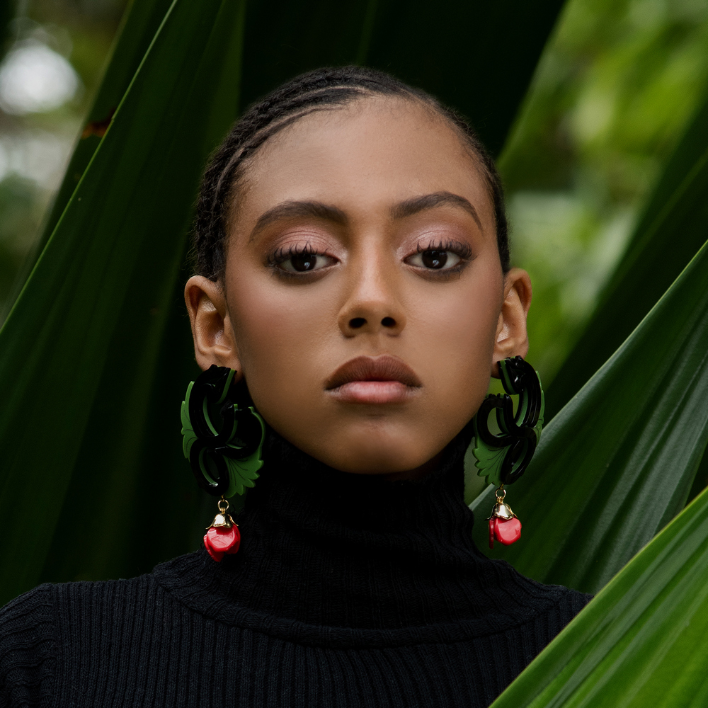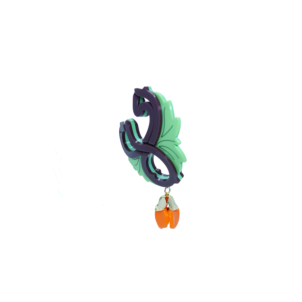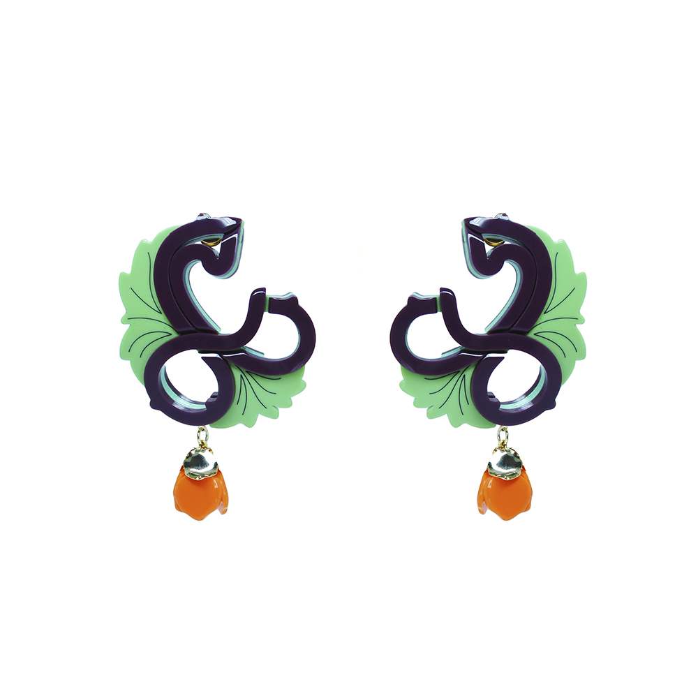 Brinco de acrílico, feito à mão, com conta de vidro e metal com acabamento dourado.