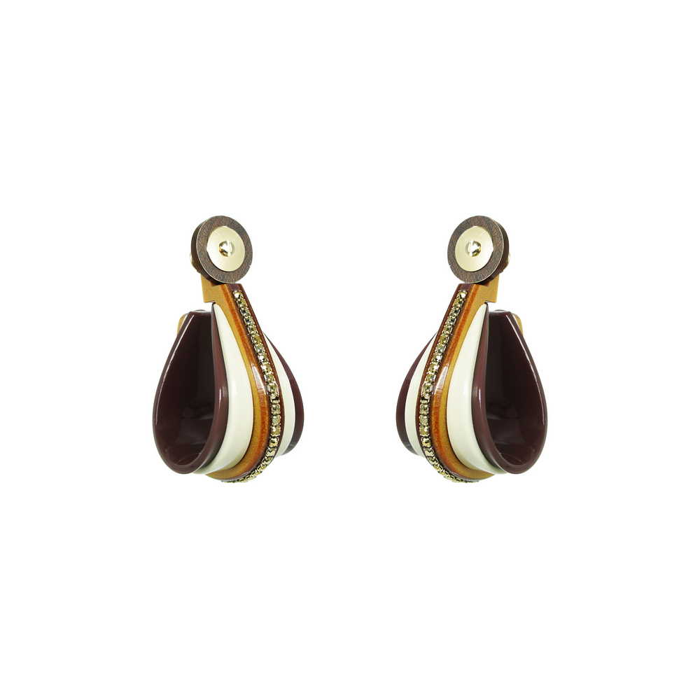 Brinco feito de acrílico, modelo argola, com aplicação de fórmica e filigrana, com strass de vidro, metais com acabamento dourado. Feito a mão por artesãos brasileiros.