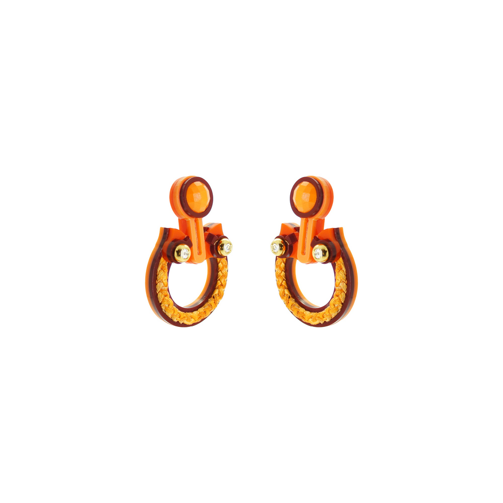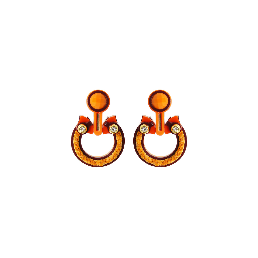 Brinco feito de acrílico, com aplicação de couro trançado, com aplicação de strass de vidro, com pedra de vidro, com corrente em latão com acabamento dourado, pino de brinco em aço inox. Feito a mão por artesãos brasileiros.