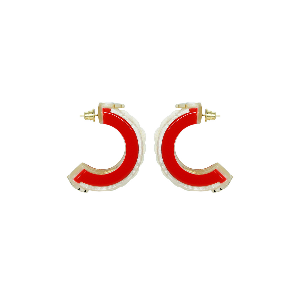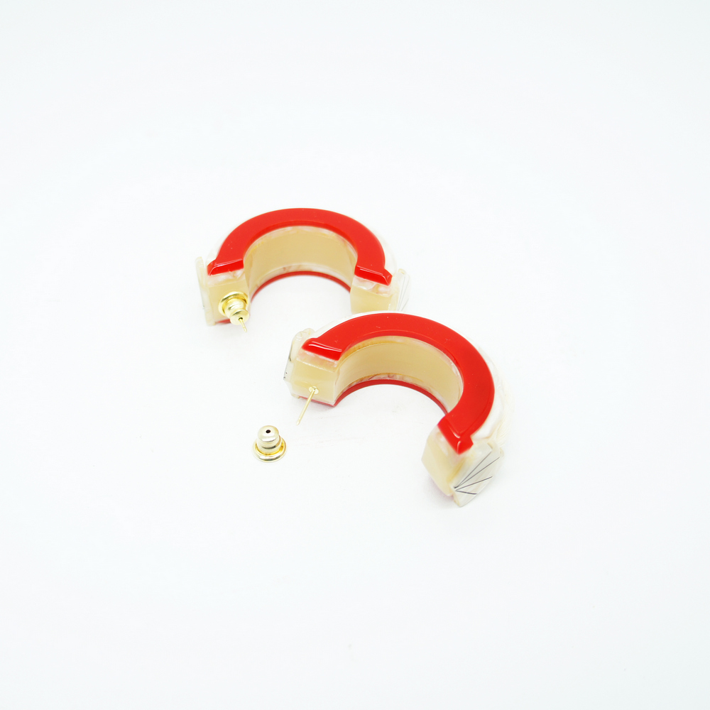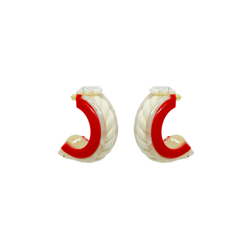Brinco feito de acrílico, modelo argola com aplicação de cordão trançado de algodão, metais com acabamento dourado. Feito a mão por artesãos brasileiros.