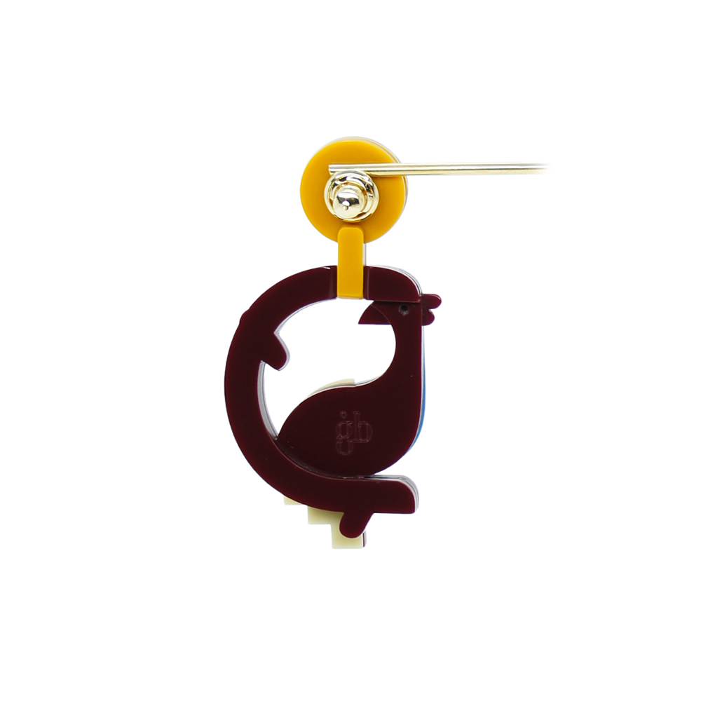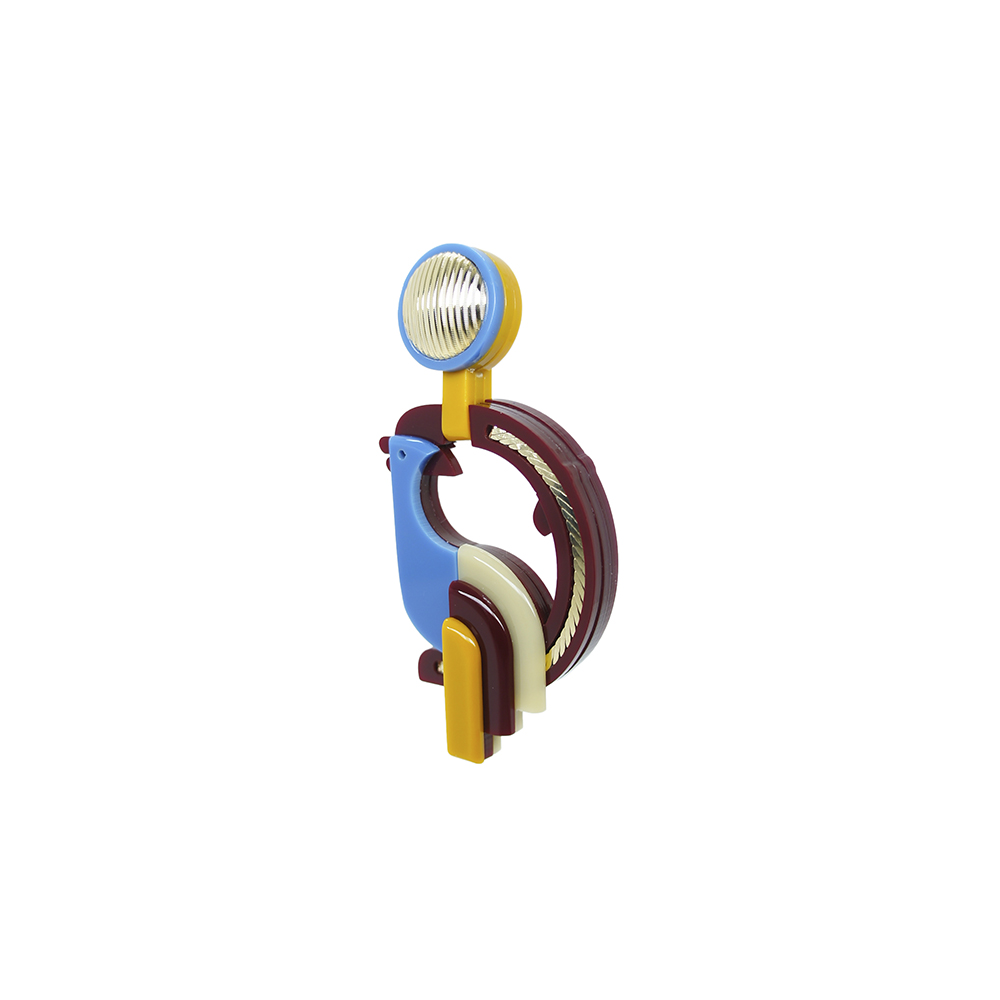 Brinco artesanal de acrílico, articulado e metais com acabamento dourado.