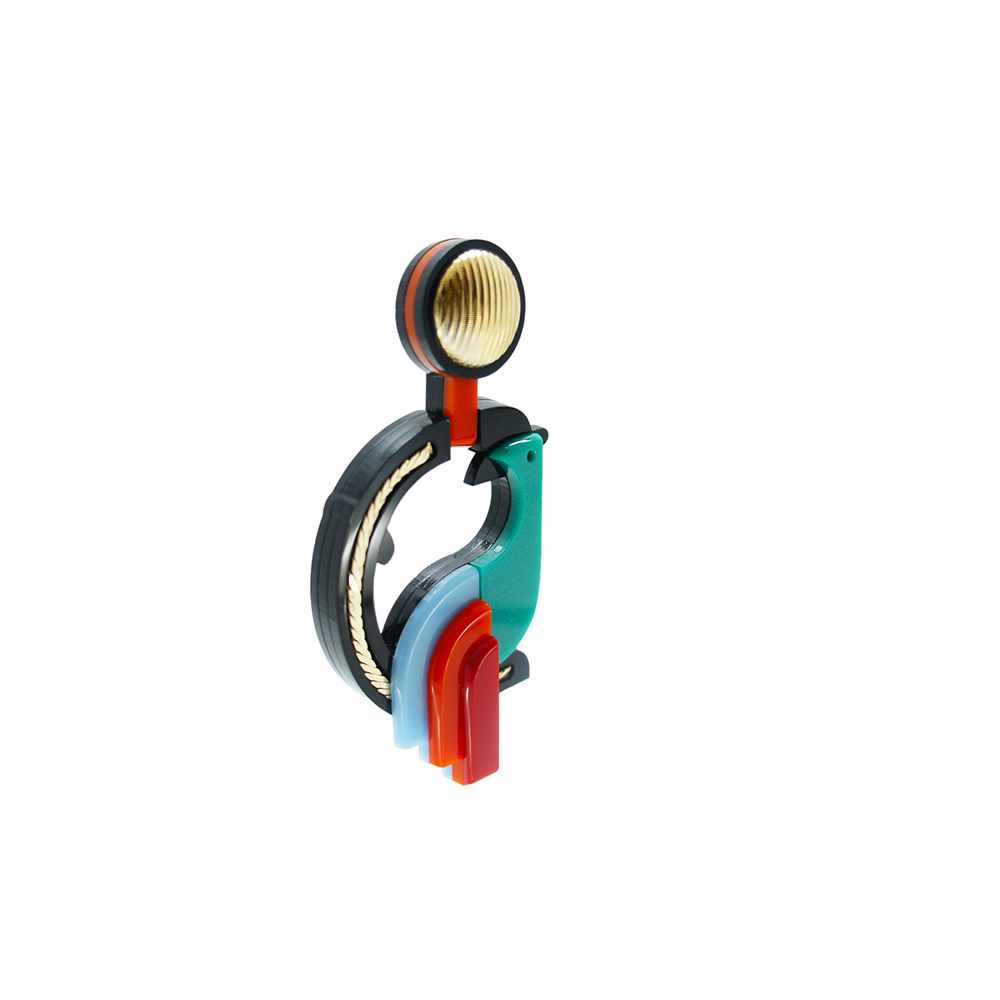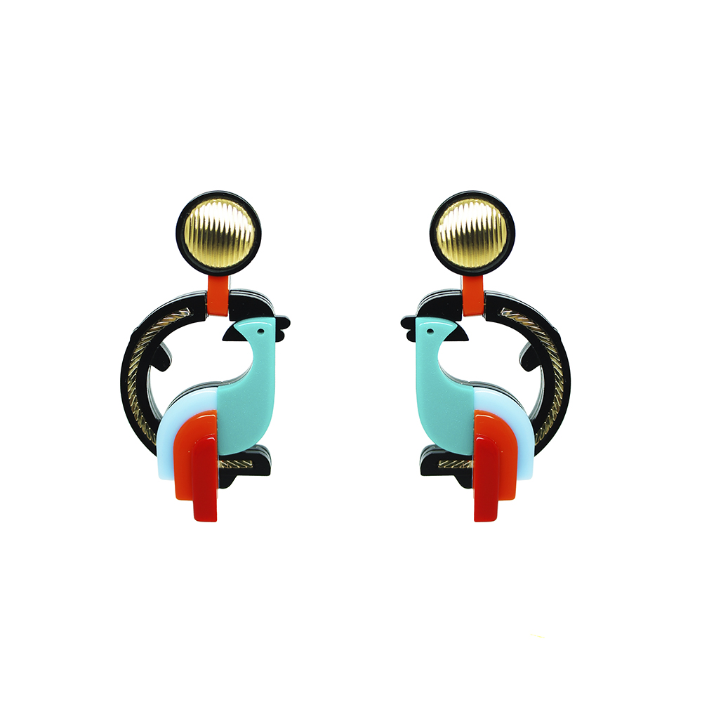 Brinco artesanal de acrílico, articulado e metais com acabamento dourado.