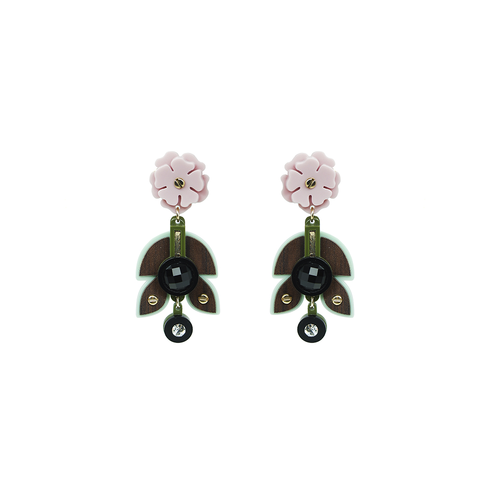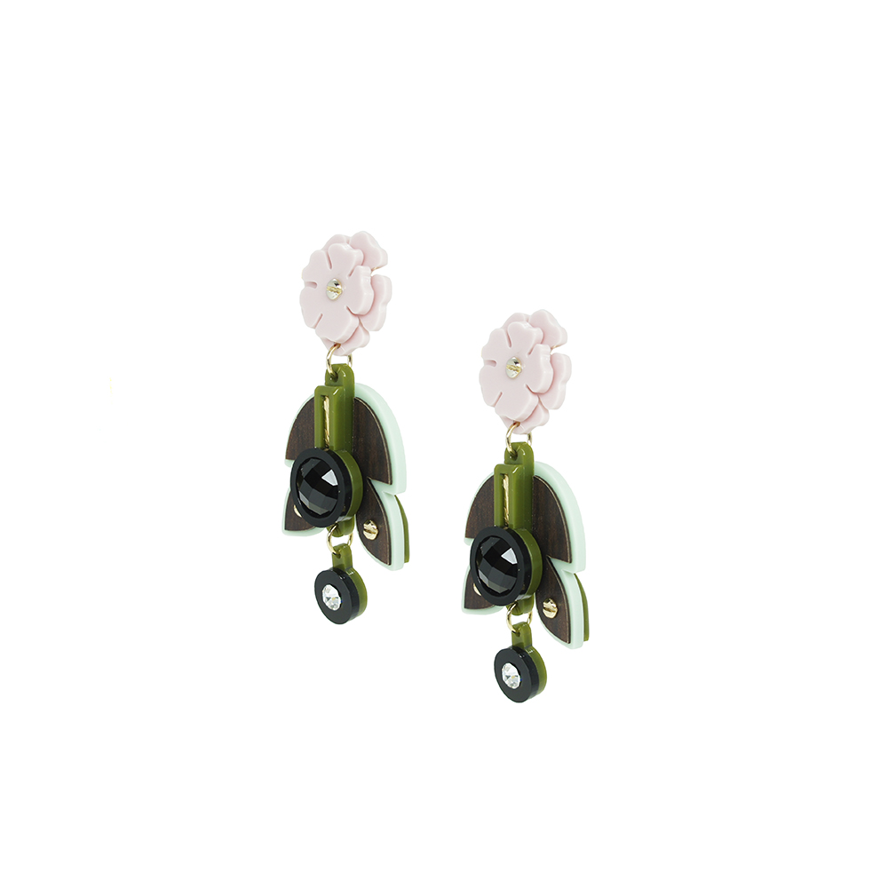 Brinco de acrílico artesanal, com aplicação de fórmica, pedra de vidro e metais com acabamento dourado.