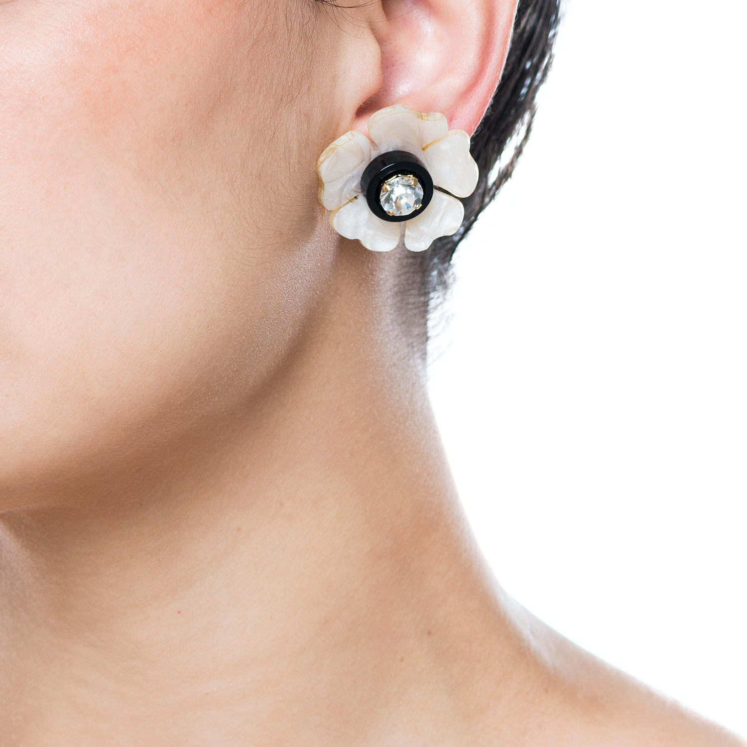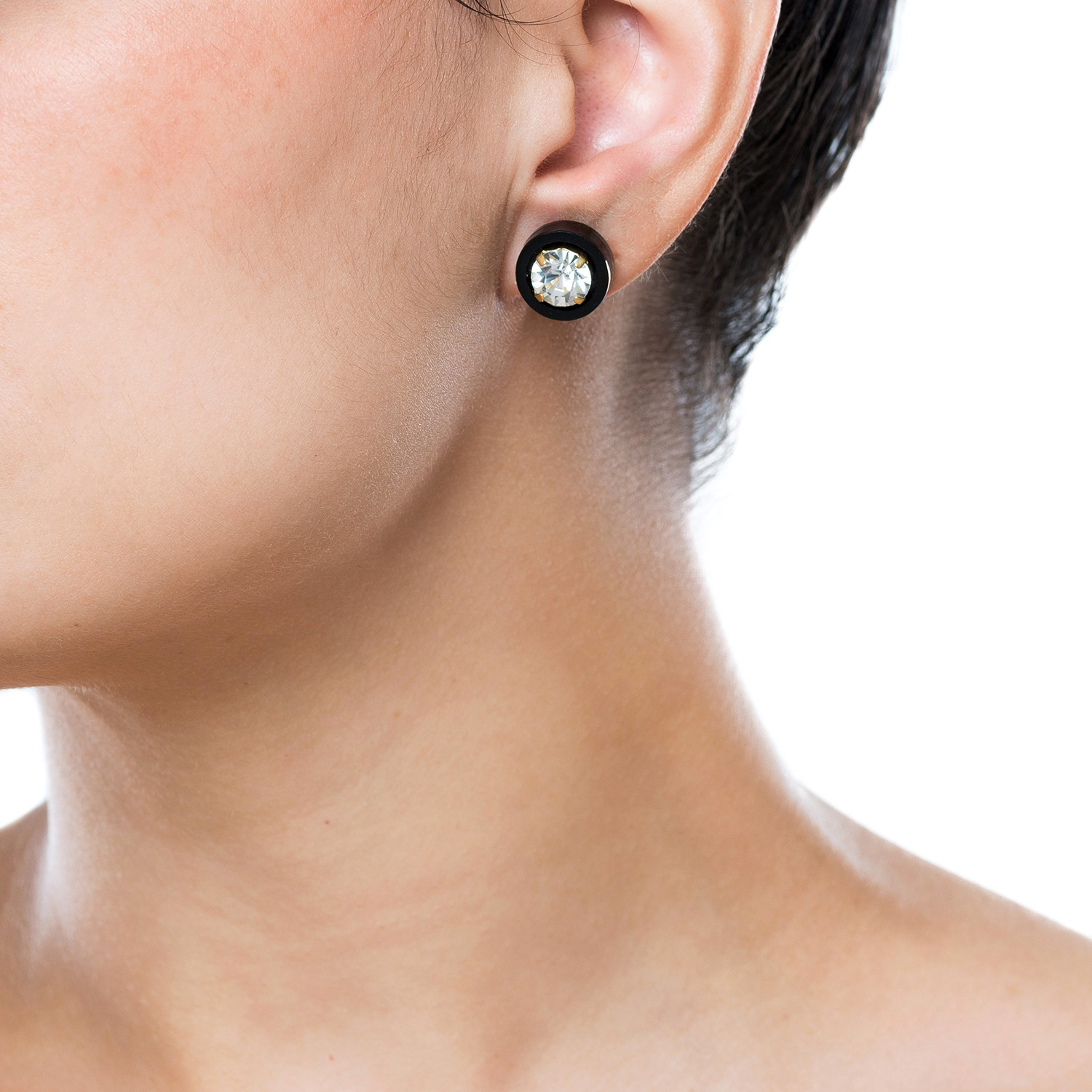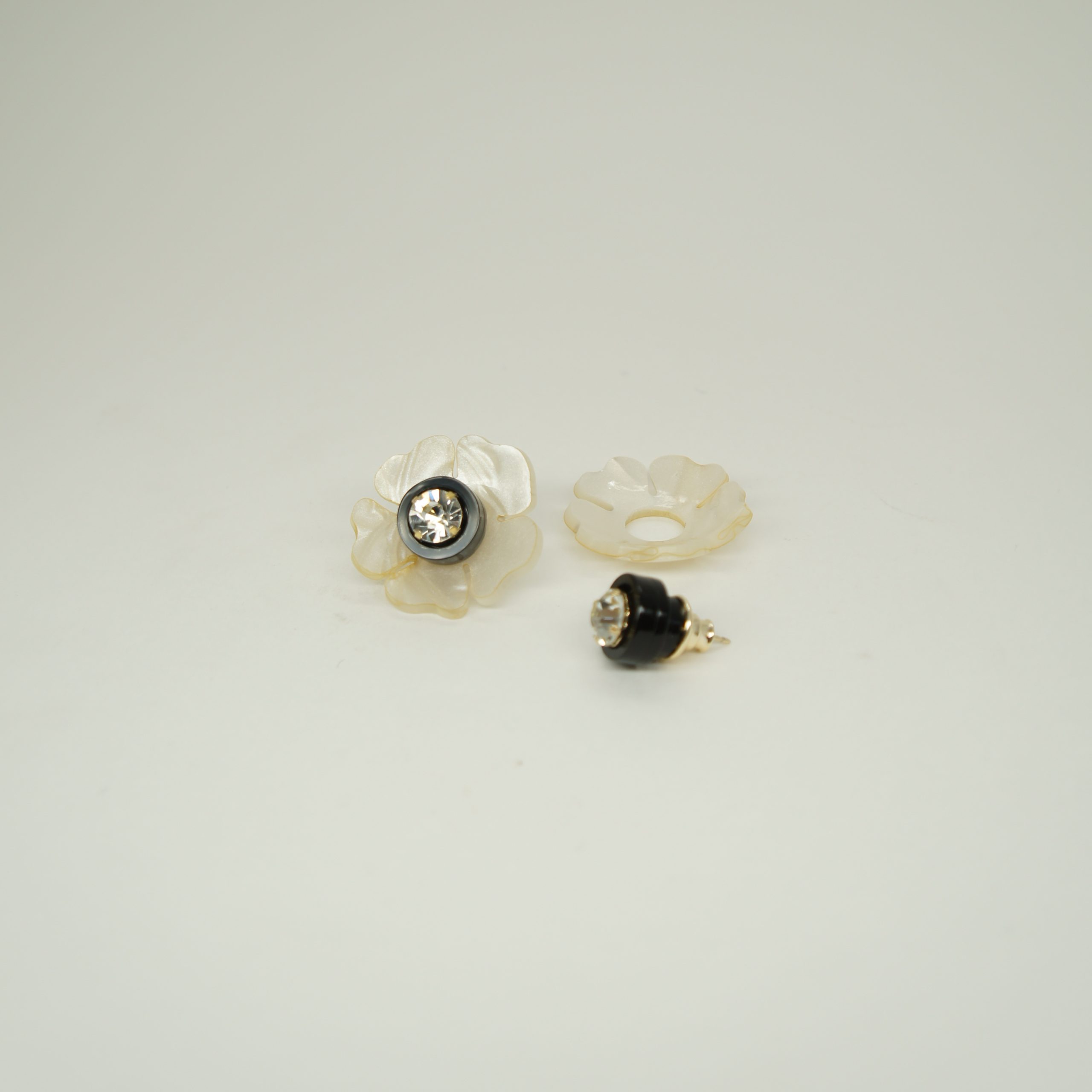 Brinco feito de acrílico, com aplicação de strass de vidro, com pino em aço inox. Modelo kit, podendo ser utilizado em sua versão completa ou somente o botão de strass. Feito a mão por artesãos brasileiros.