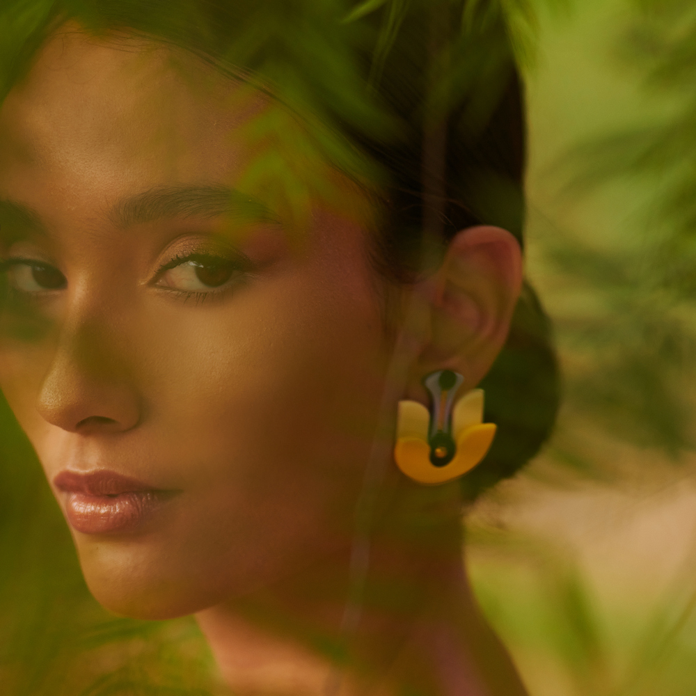 Brinco curto de acrílico com conta de ABS e aplicação de corrente. Metais com acabamento dourado. Feito à mão por artesãos brasileiros.