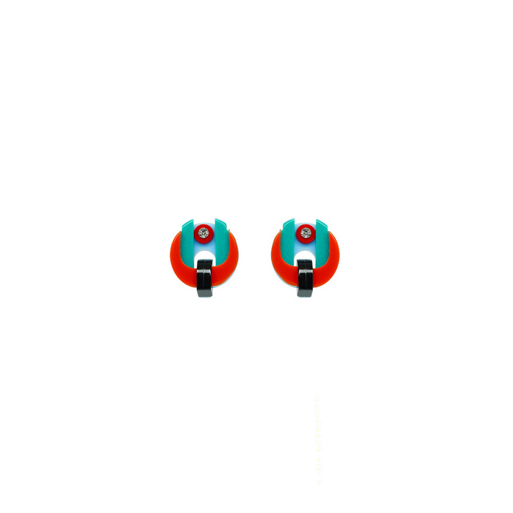 Brinco curto de acrílico com aplicação de strass de vidro. Metais com acabamento dourado. Feito à mão por artesãos brasileiros.