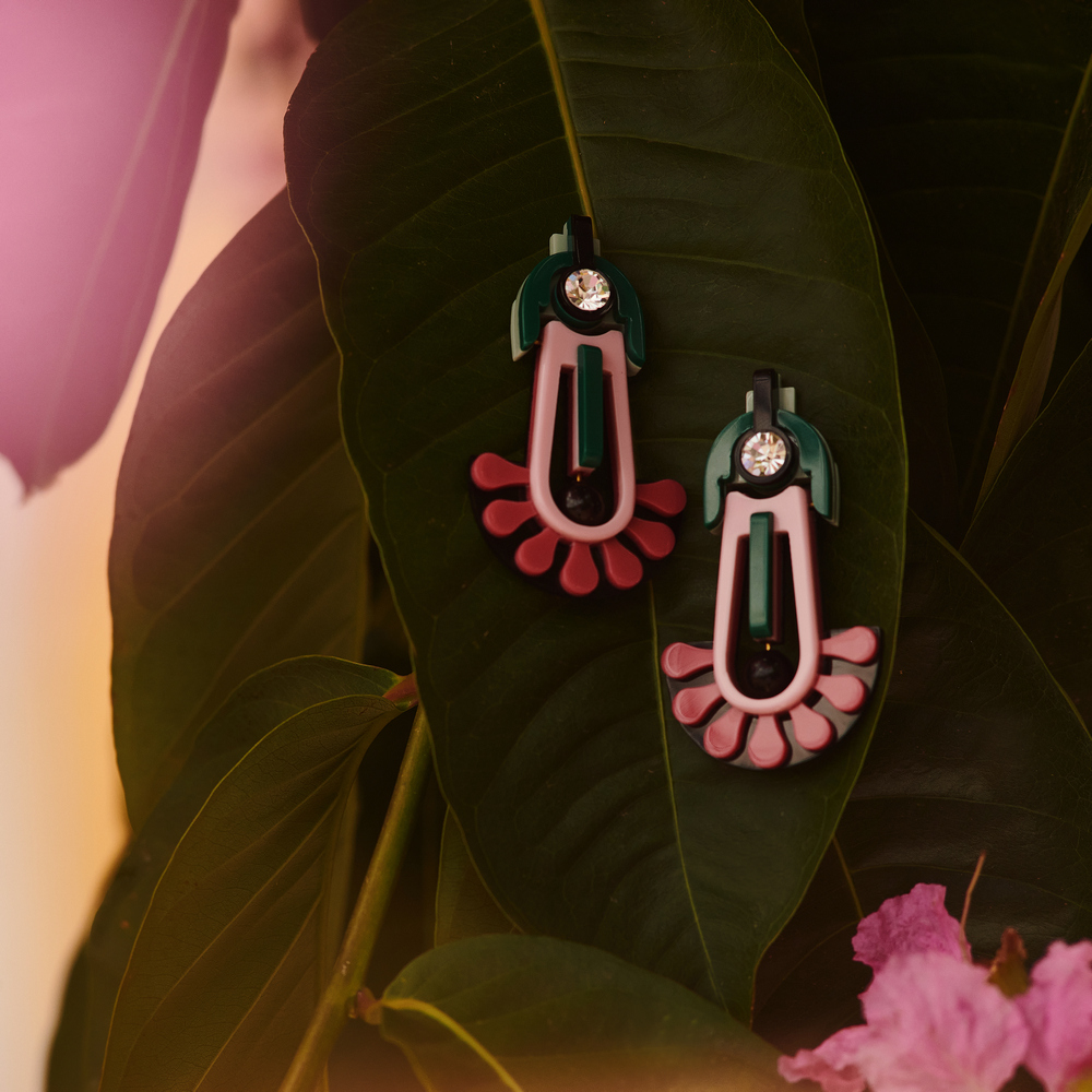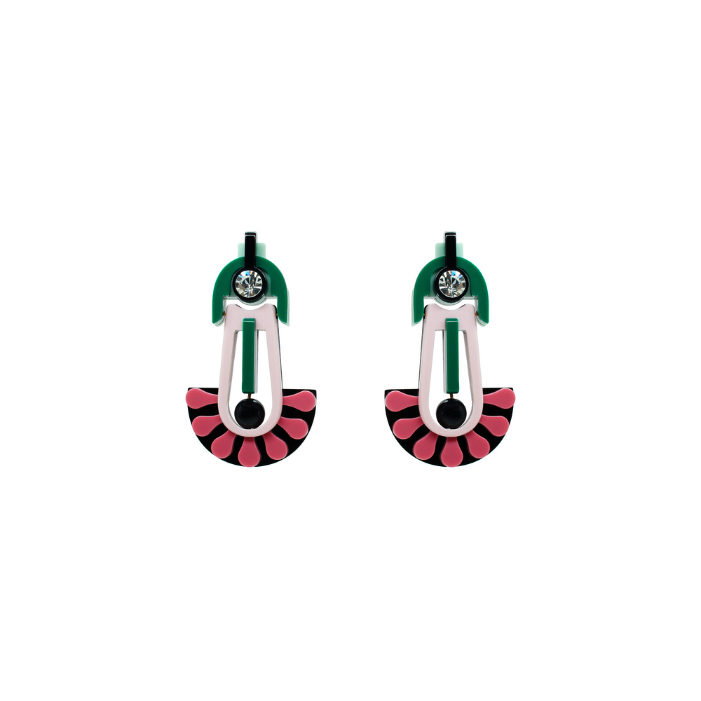 Brinco de acrílico com aplicação de strass de vidro e conta sintética. Metais com acabamento dourado. Feito à mão por artesãos brasileiros.
