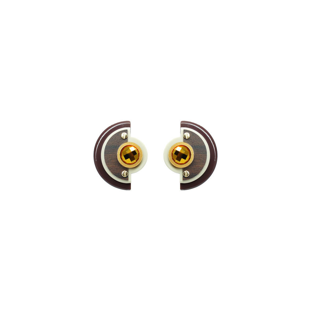 Brinco de acrílico, com aplicação de fórmica, com pedra de vidro espelhada, com pino de brinco em aço inox. Feito a mão por artesãos brasileiros.
