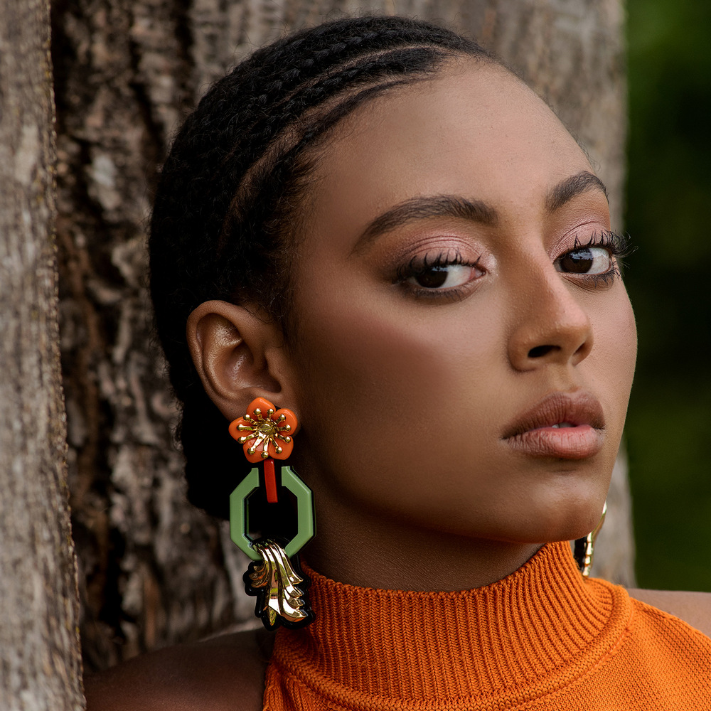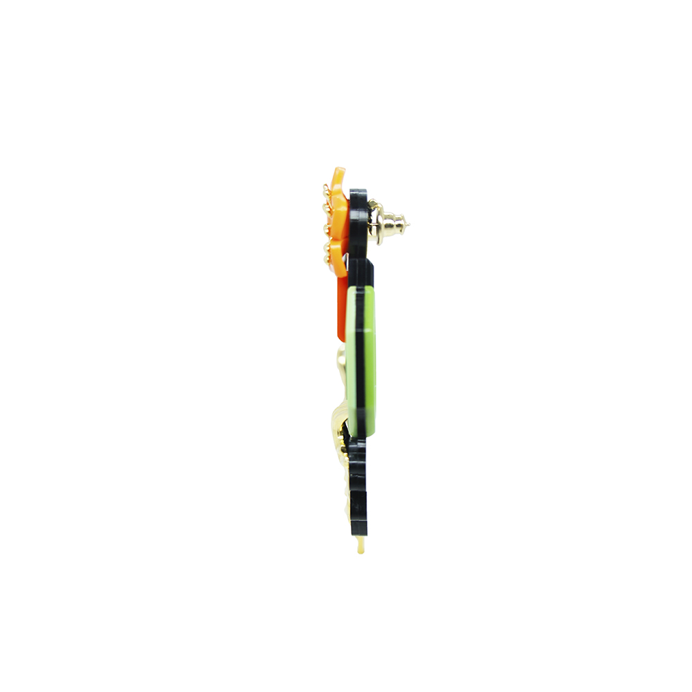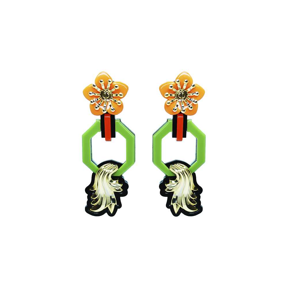 Brinco Feito à mão de acrílico, articulado e metais com acabamento dourado.