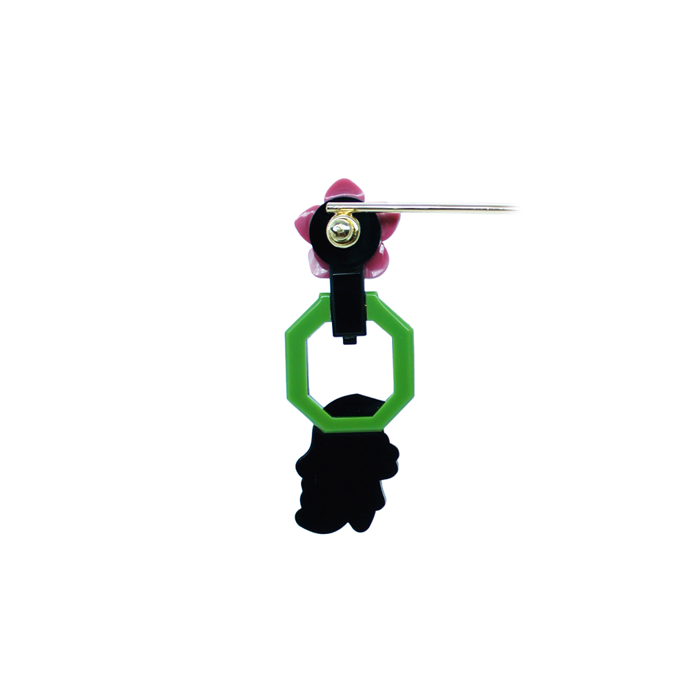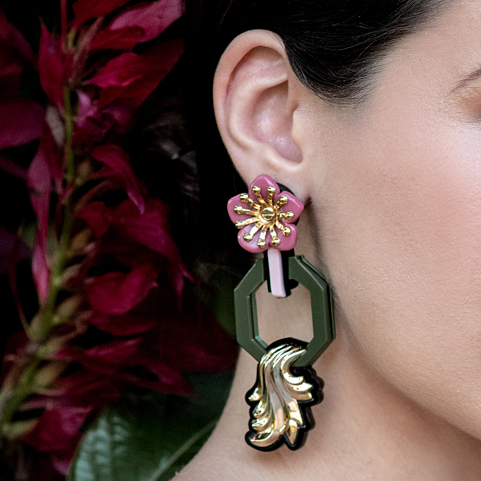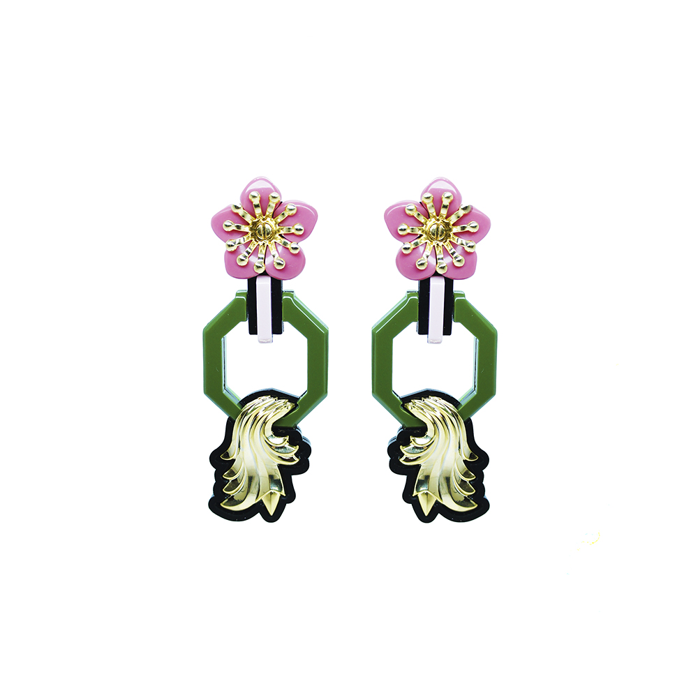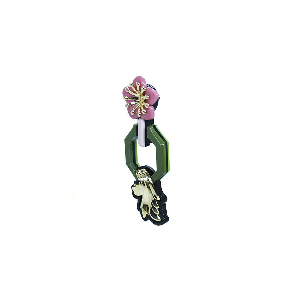 Brinco Feito à mão de acrílico, articulado e metais com acabamento dourado.