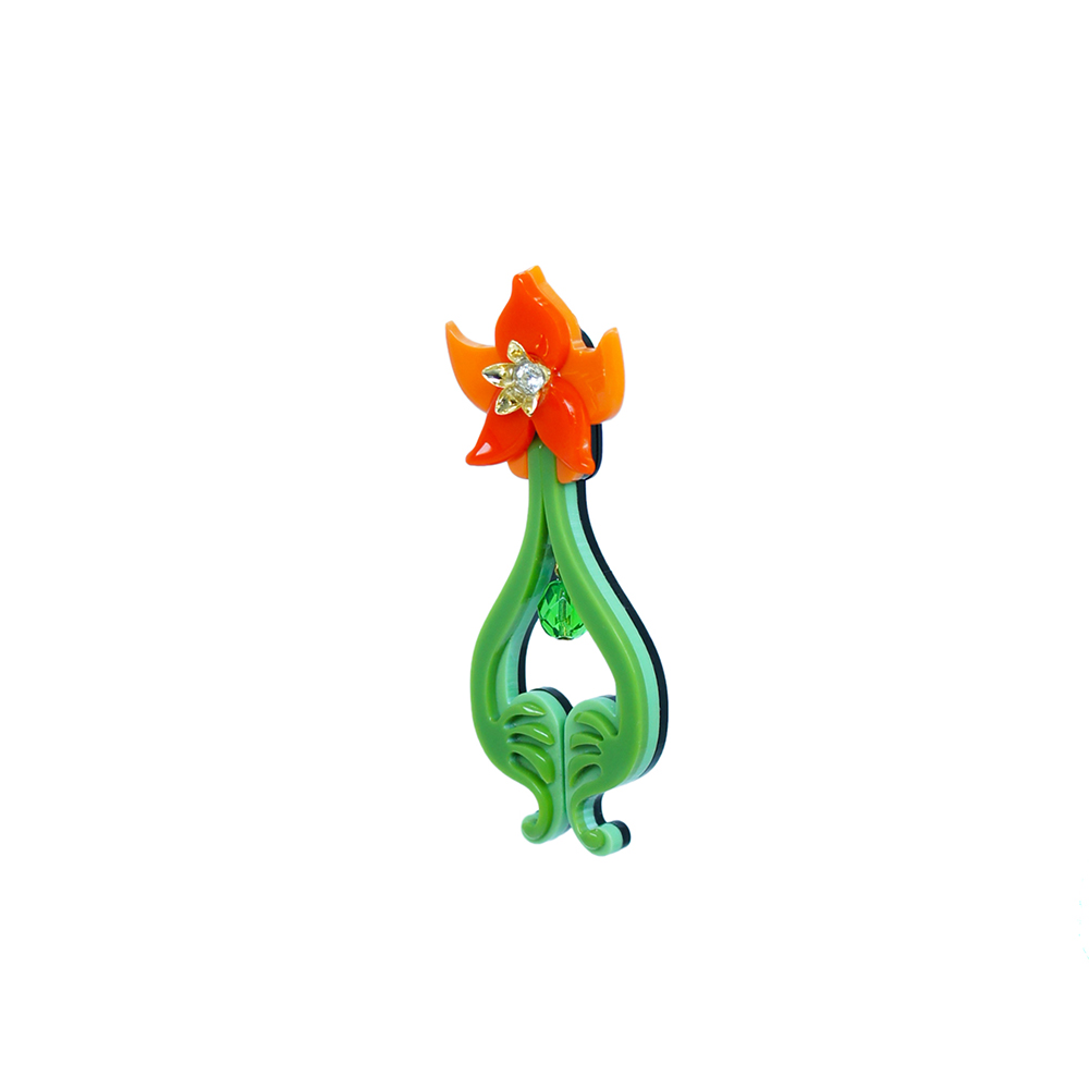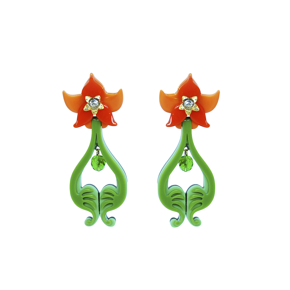 Brinco de acrílico feito à mão com conta de cristal, strass, metais com acabamento dourado.