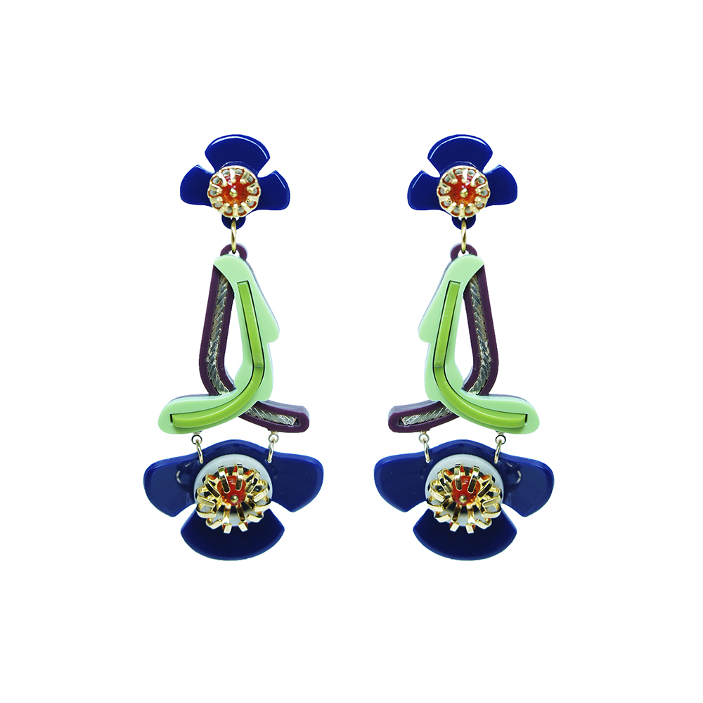 Brinco de acrílico feito à mão, articulado, com conta de vidro e metal com acabamento dourado.