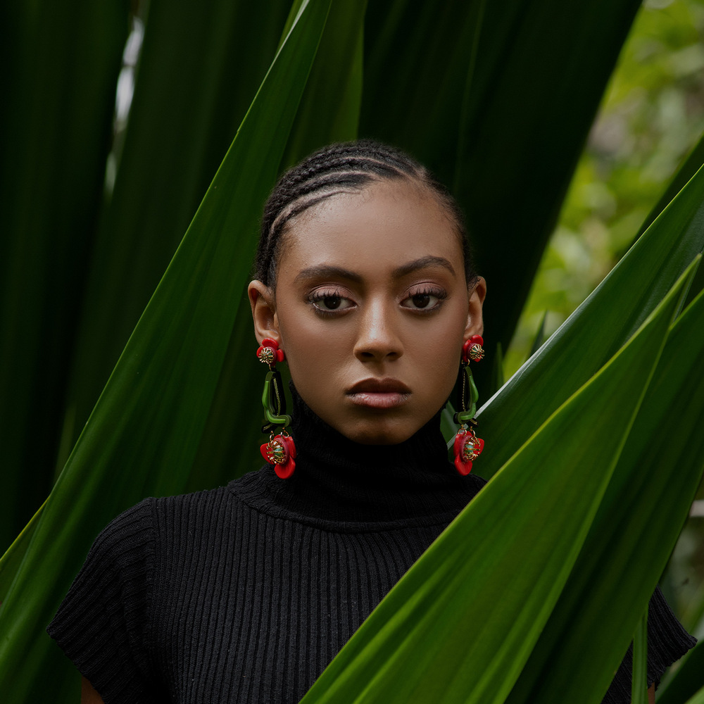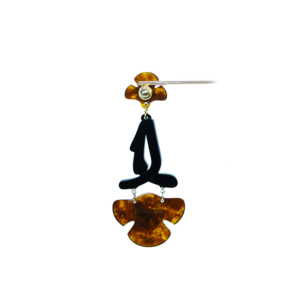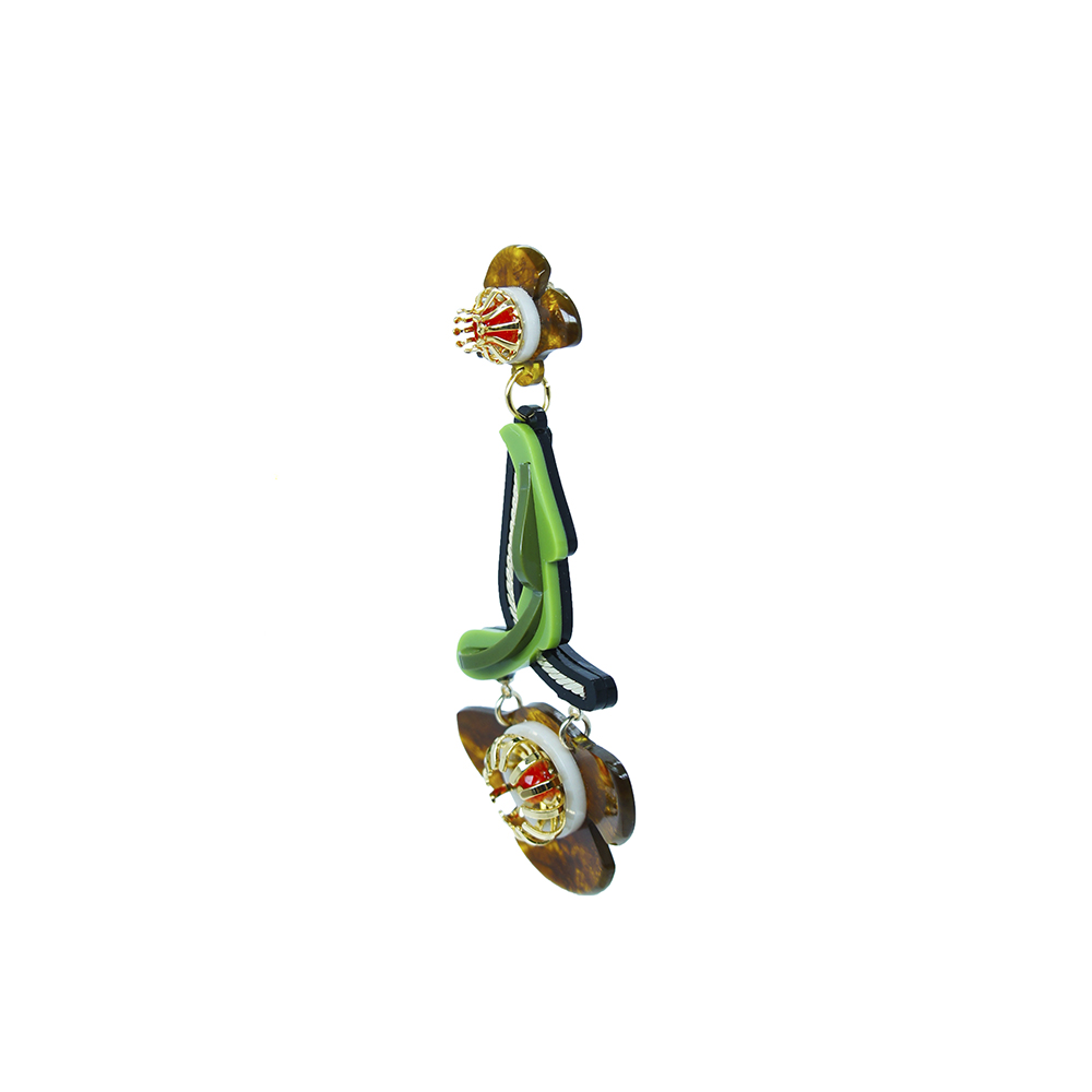 Brinco de acrílico feito à mão, articulado, com conta de vidro e metal com acabamento dourado.