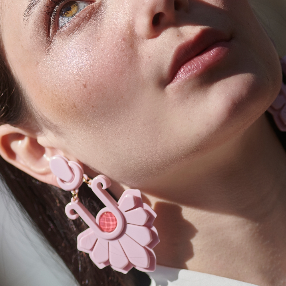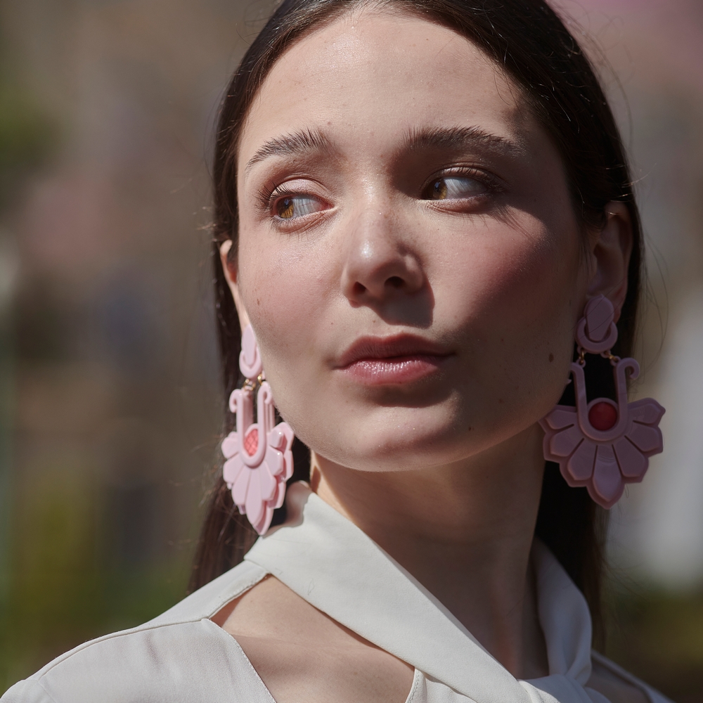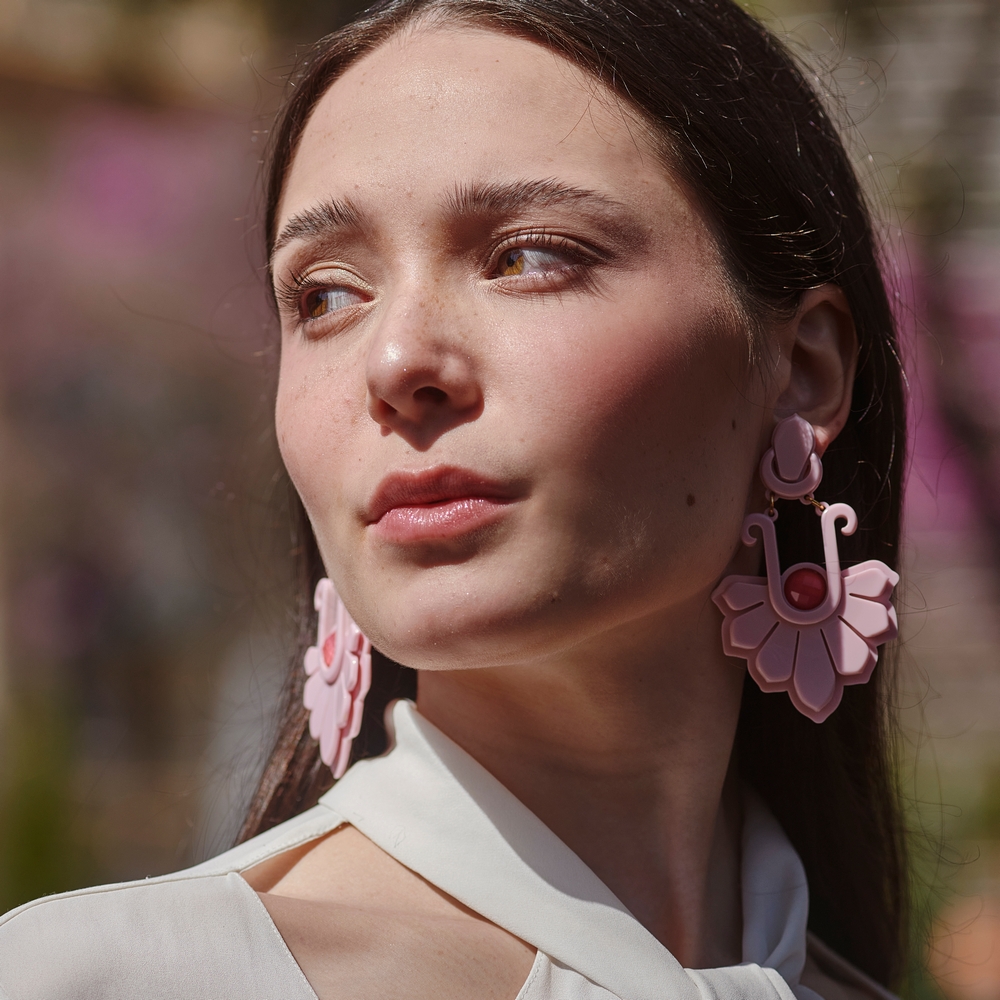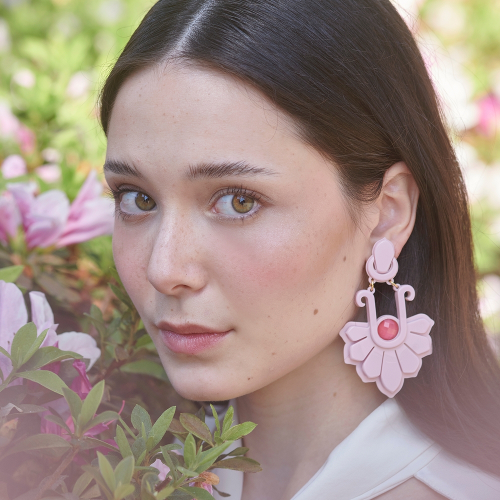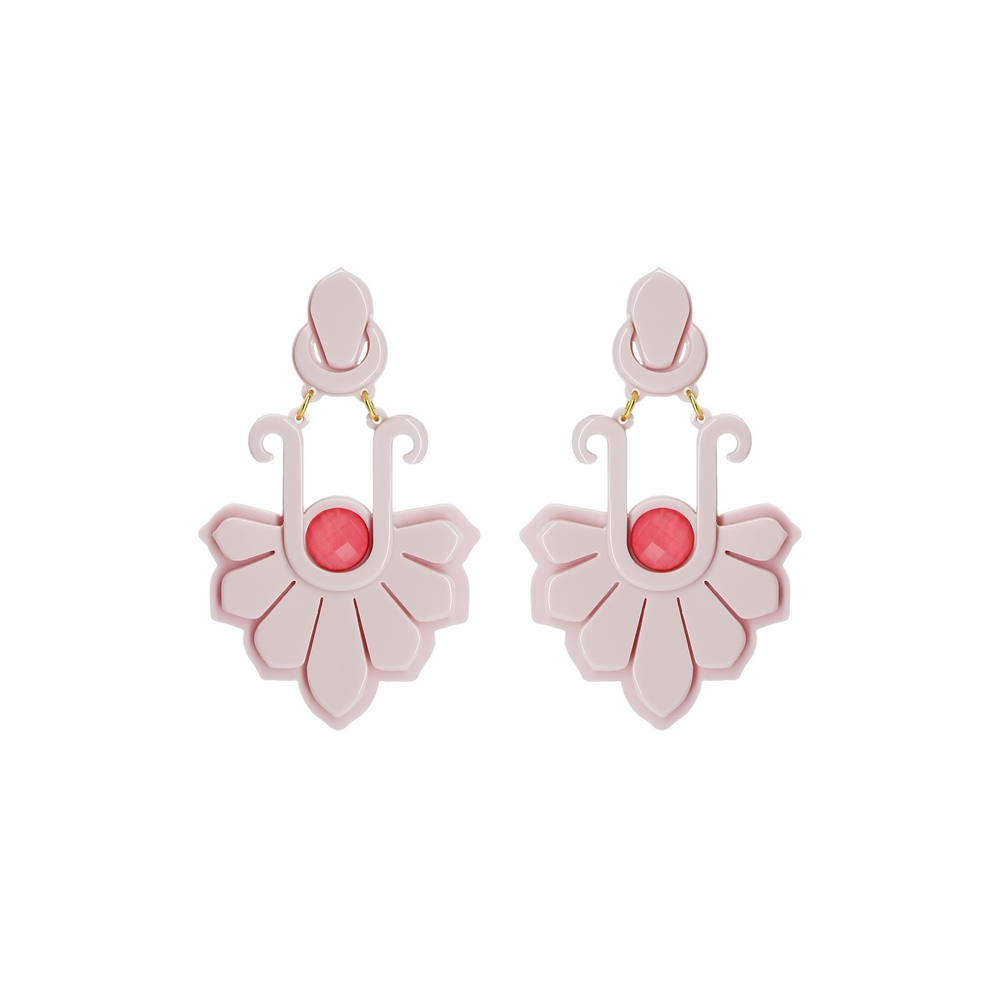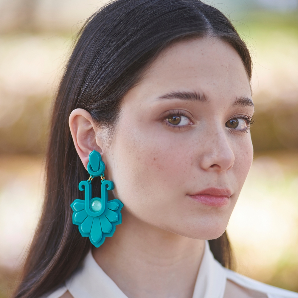 Brinco feito de acrílico, modelo pendente, articulado, com aplicação de pedra de vidro, com pino de brinco em latão, metais com acabamento dourado. Feito a mão por artesãos brasileiros.