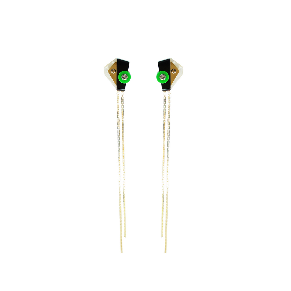 Brinco de acrílico, com aplicação de strass de vidro, com franja de corrente, detalhe em metal dourado e metais com acabamento dourado. Feito a mão por artesãos brasileiros.