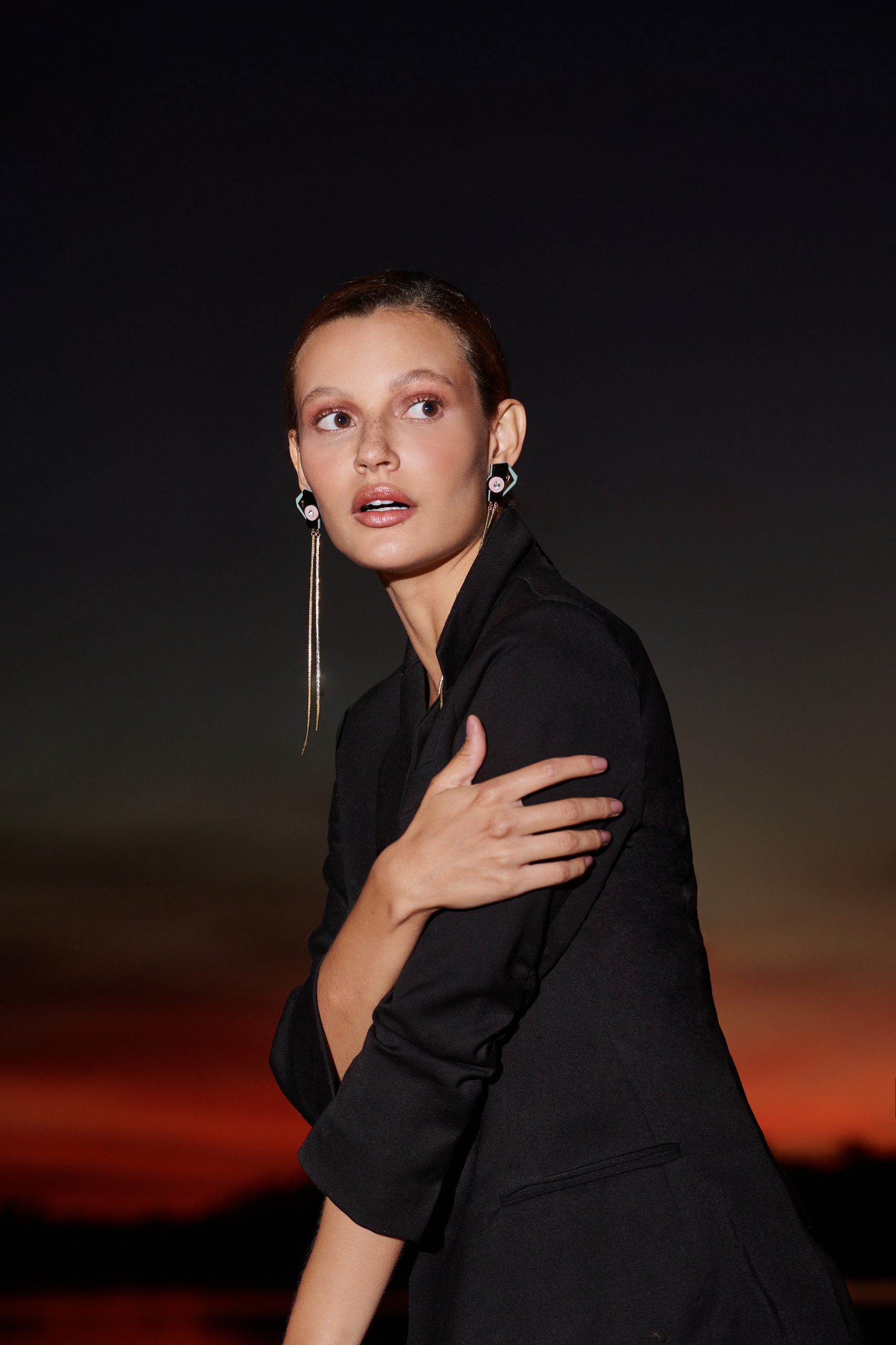 Brinco de acrílico, com aplicação de strass de vidro, com franja de corrente, detalhe em metal dourado e metais com acabamento dourado. Feito a mão por artesãos brasileiros.