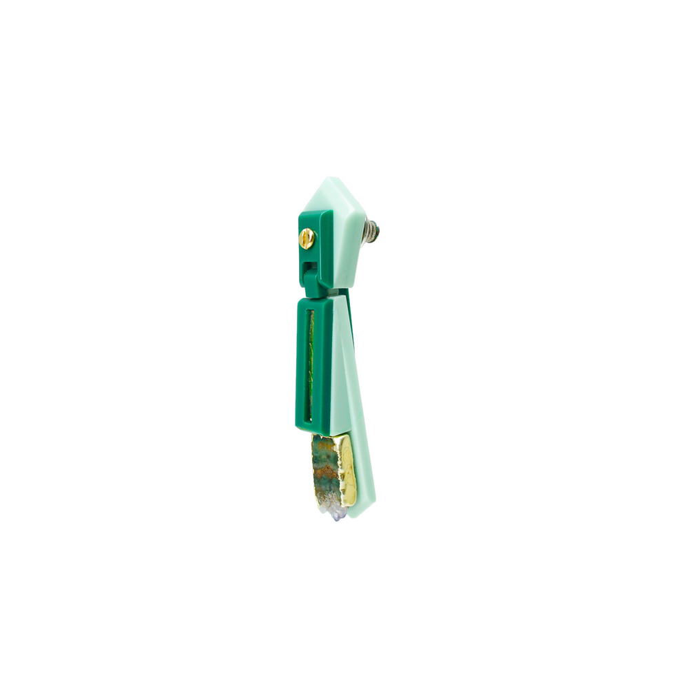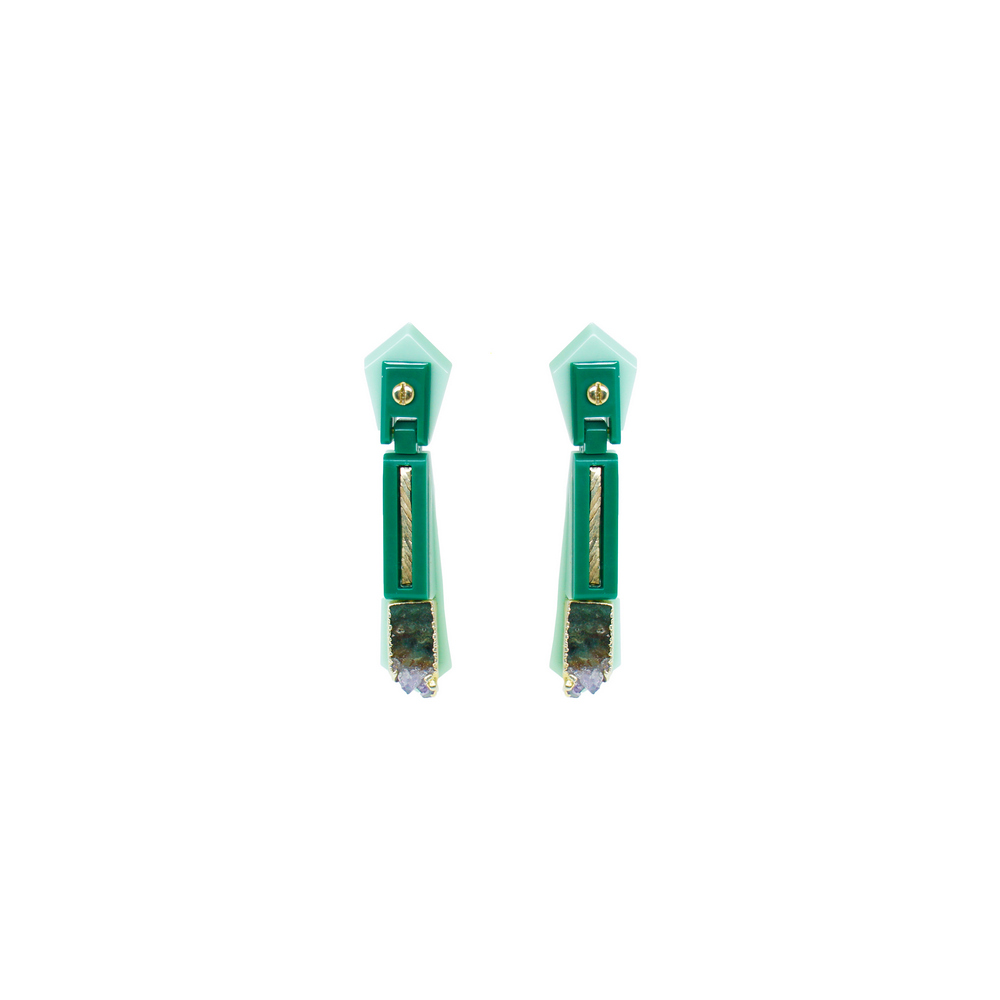 Brinco de acrílico, artesanal, com aplicação de pedra natural Ametista, corrente e metais com acabamento dourado.