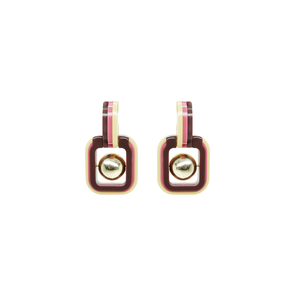 Brinco em acrílico, articulado, feito à mão, tamanho médio, com conta ABS e metais com acabamento dourado.