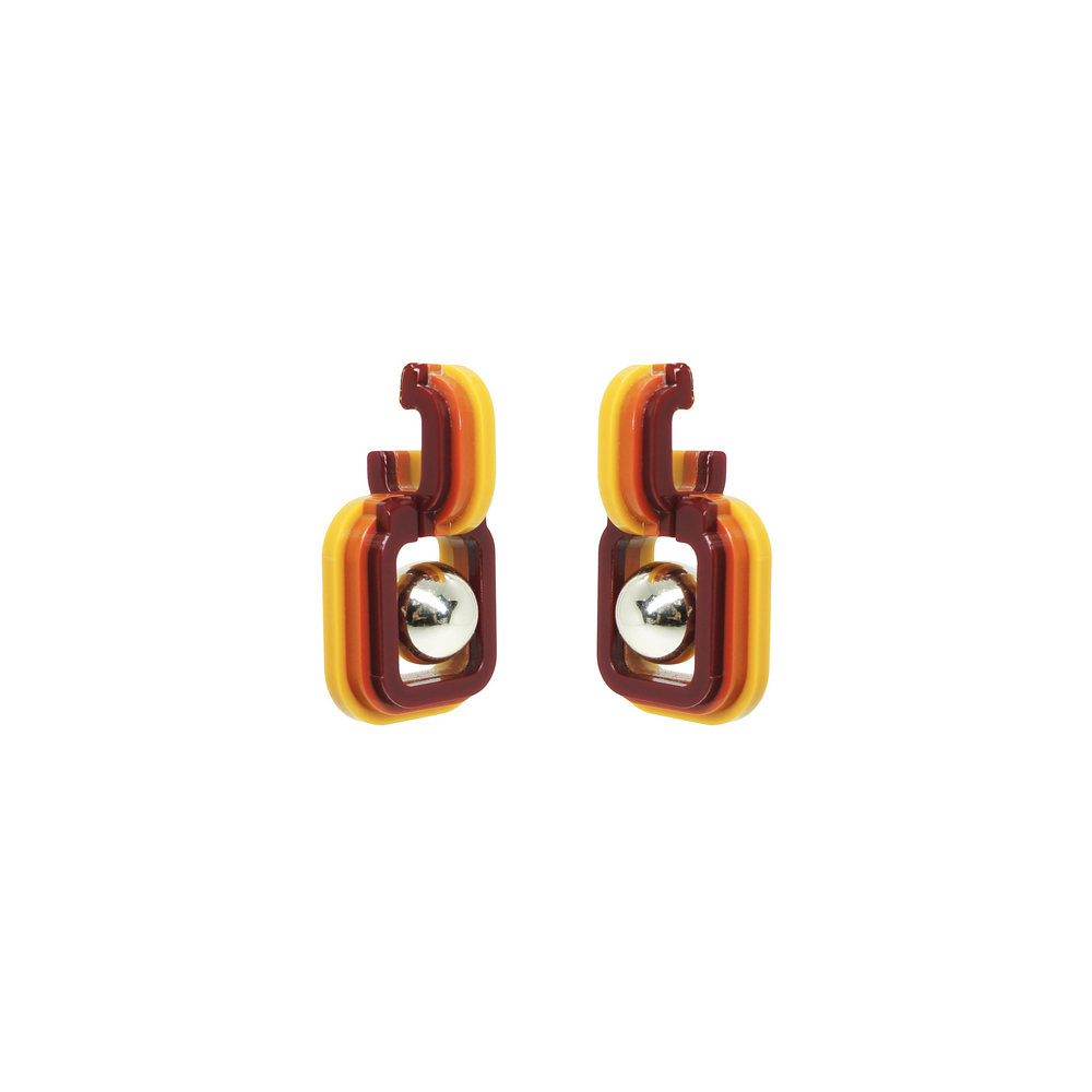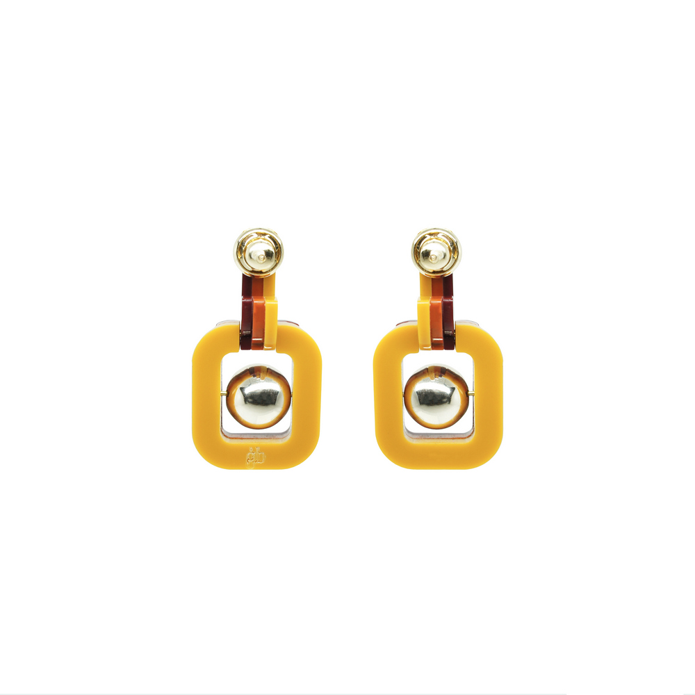 Brinco em acrílico, articulado, feito à mão, tamanho médio, com conta ABS e metais com acabamento dourado.
