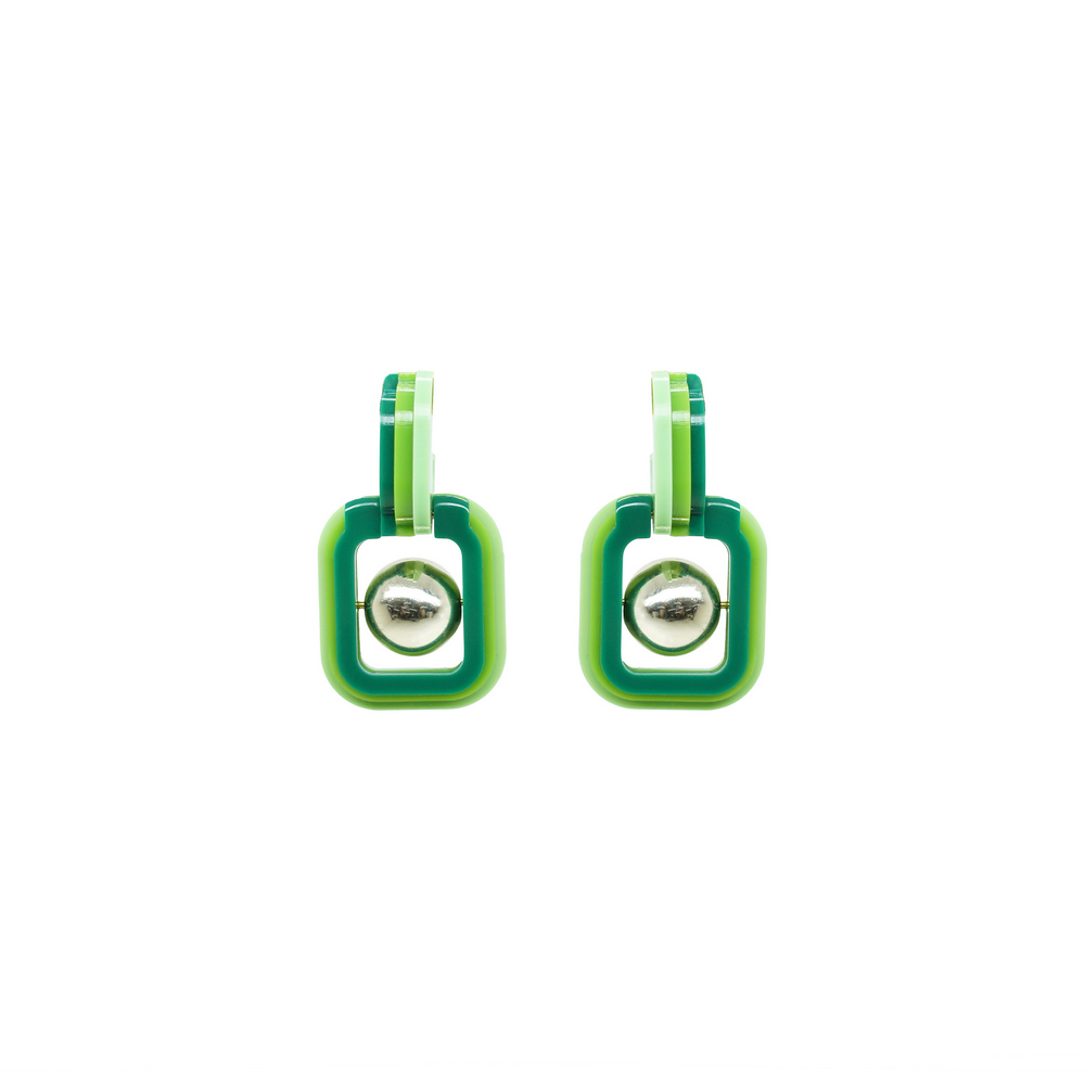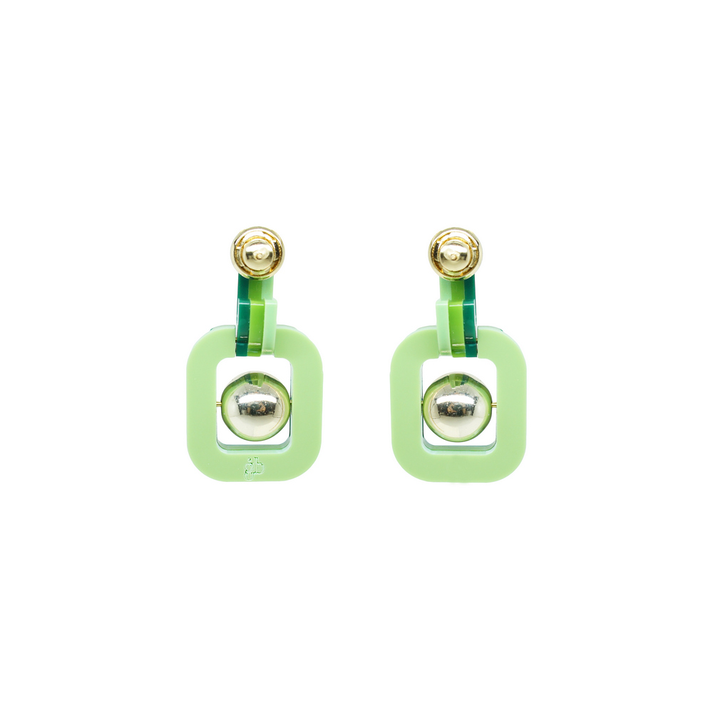 Brinco em acrílico, articulado, feito à mão, tamanho médio, com conta ABS e metais com acabamento dourado.