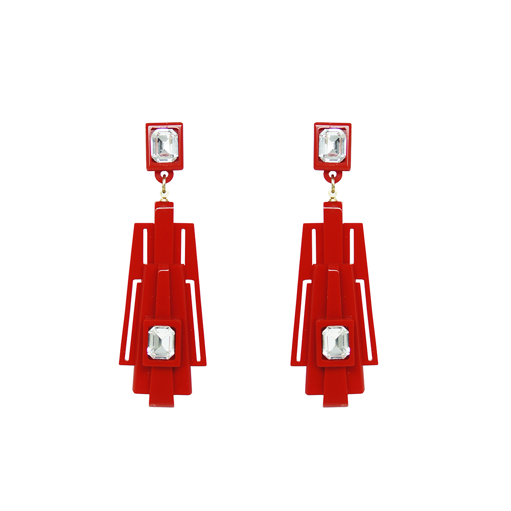 Brinco artesanal de acrílico, articulado, com pedra de vidro e metais com acabamento dourado.