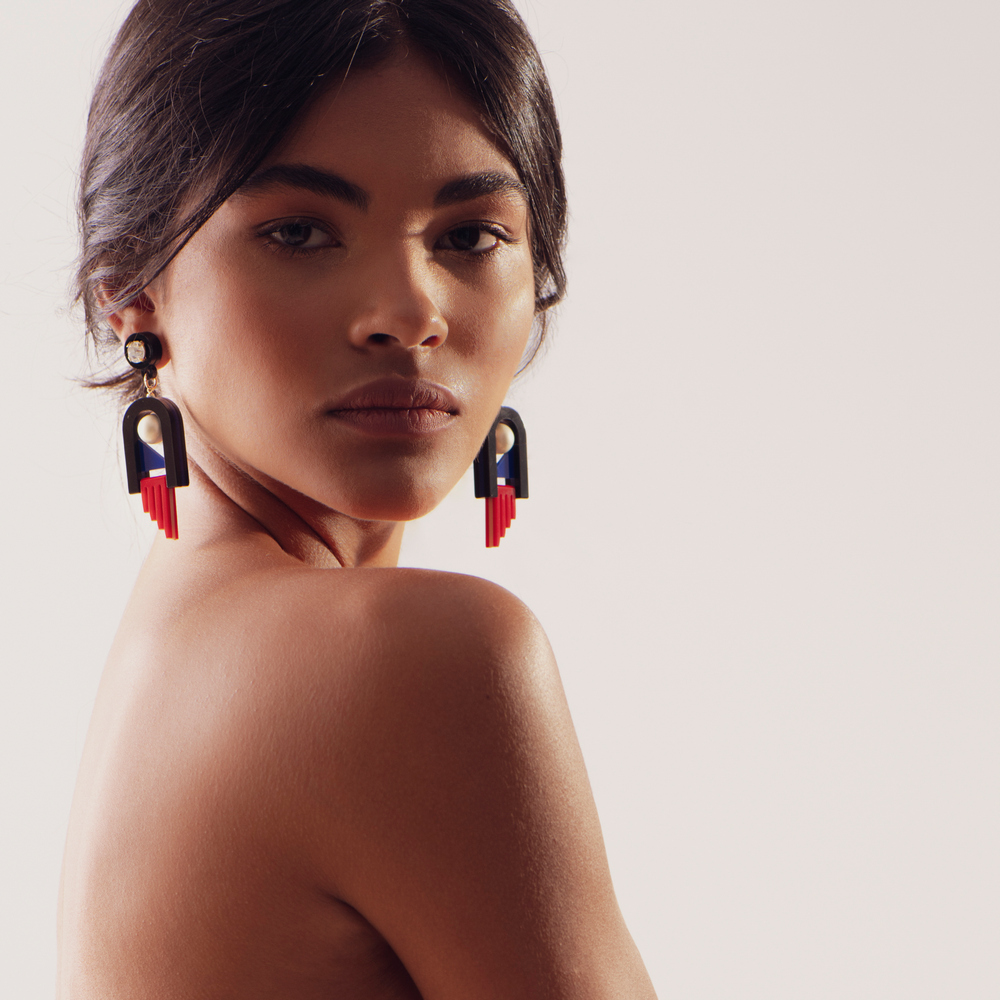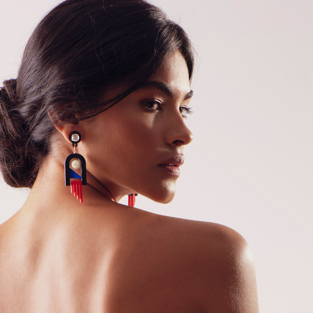Brinco de acrílico, feito à mão, modelo articulado, com pérola Shell, strass de vidro, metais com acabamento dourado.