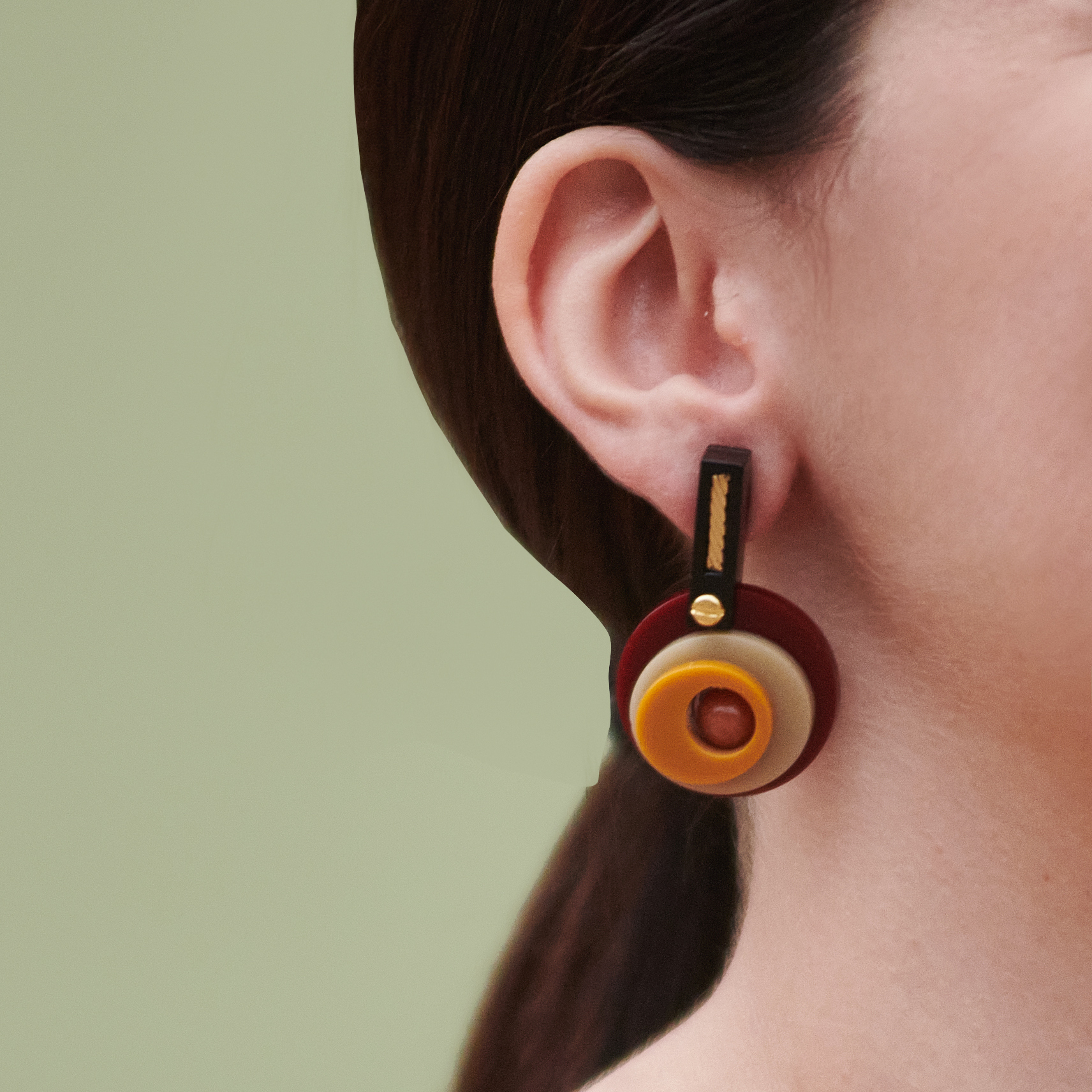 Brinco de acrílico, feito à mão, tamanho curto, com conta ABS e metais com acabamento dourado.