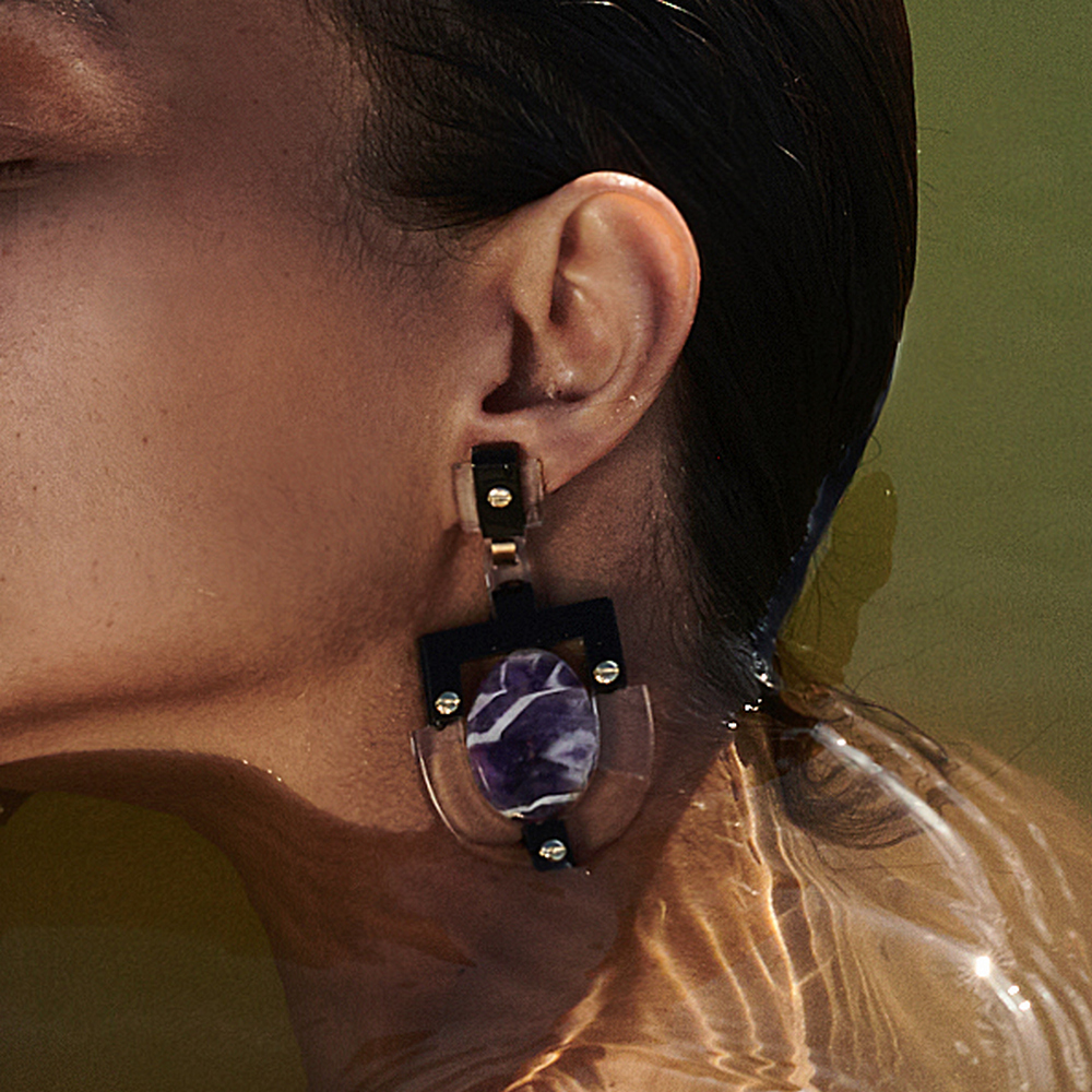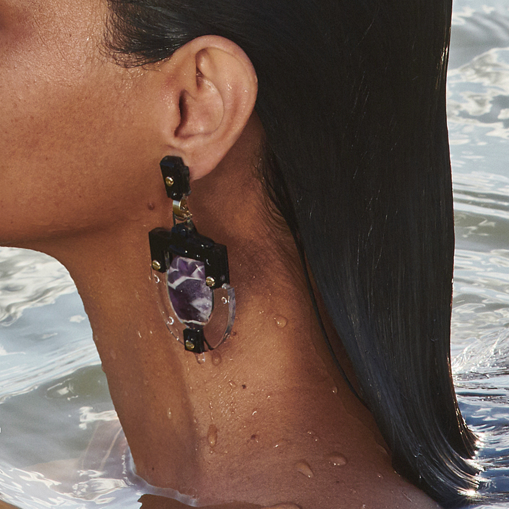 Brinco de acrílico com aplicação de pedra Ametista facetada e metais com acabamento dourado. Espera-se que as variações nos padrões das pedras tornem cada peça única.