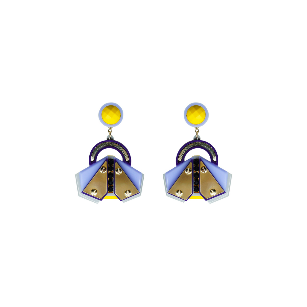 Brinco de acrílico, com aplicação de strass de vidro, aplicação de corrente, detalhe em metal dourado e metais com acabamento dourado. Feito a mão por artesãos brasileiros.