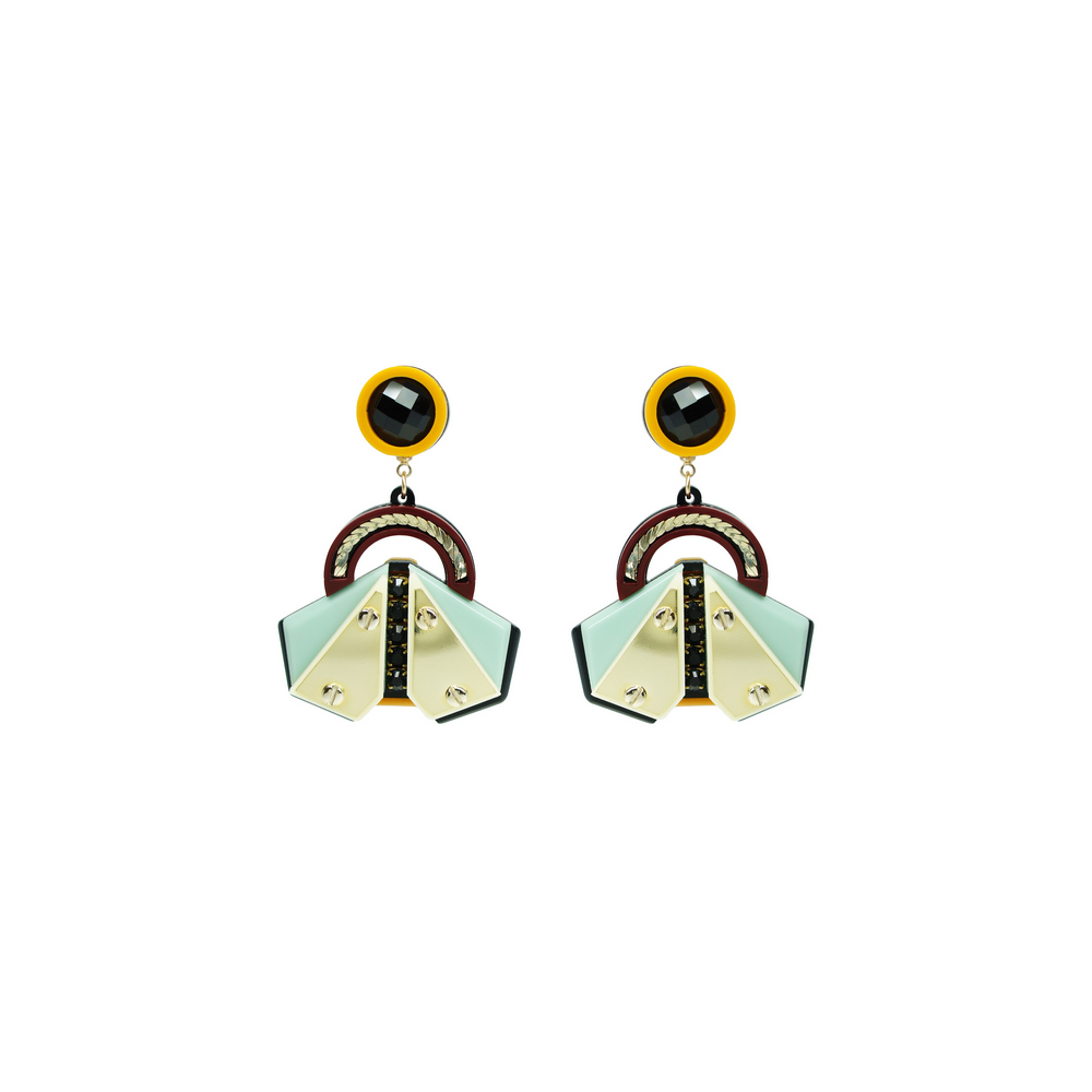Brinco de acrílico, com aplicação de strass de vidro, aplicação de corrente, detalhe em metal dourado e metais com acabamento dourado. Feito a mão por artesãos brasileiros.