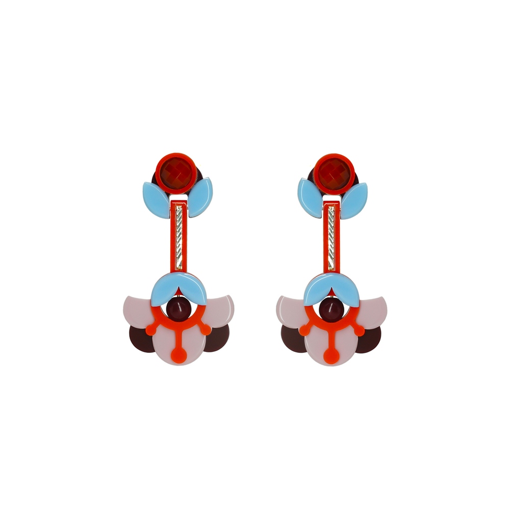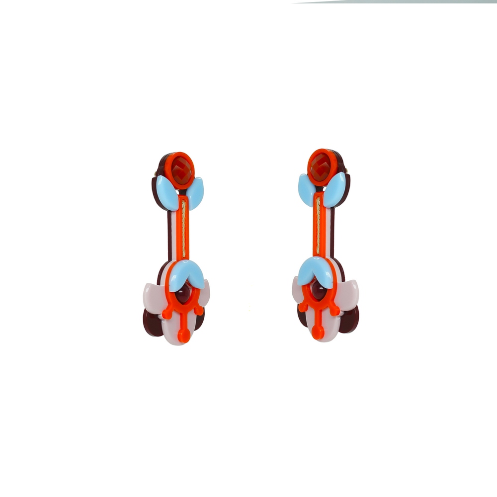 Brinco de acrílico, modelo pendente, com pedra de vidro, com conta sintética e aplicação de corrente. Metais com acabamento dourado. Feito à mão por artesãos brasileiros.