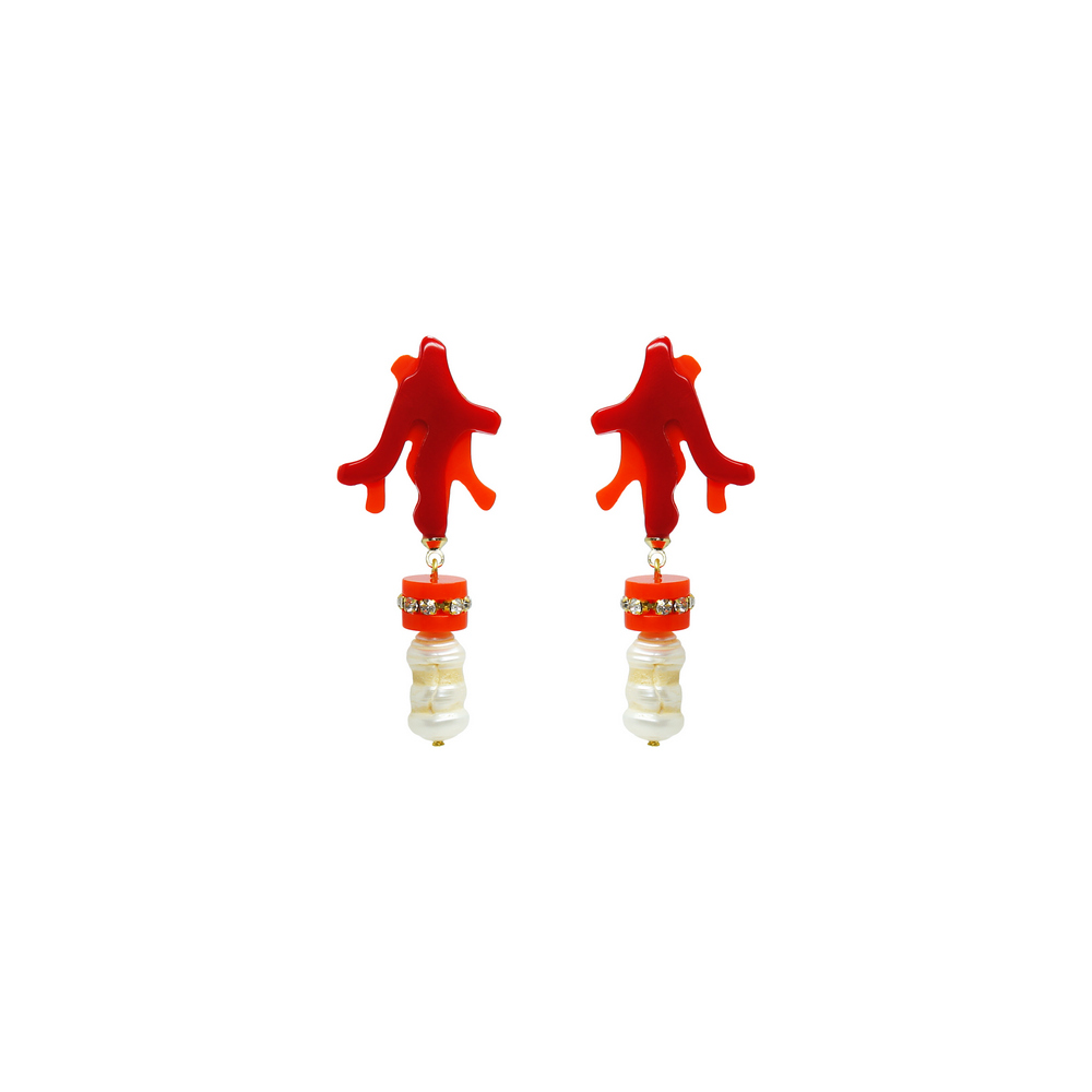 Brinco feito de acrílico, modelo pendente, com aplicação de strass de vidro, com pérola de água doce, metais com acabamento dourado. Feito a mão por artesãos brasileiros.