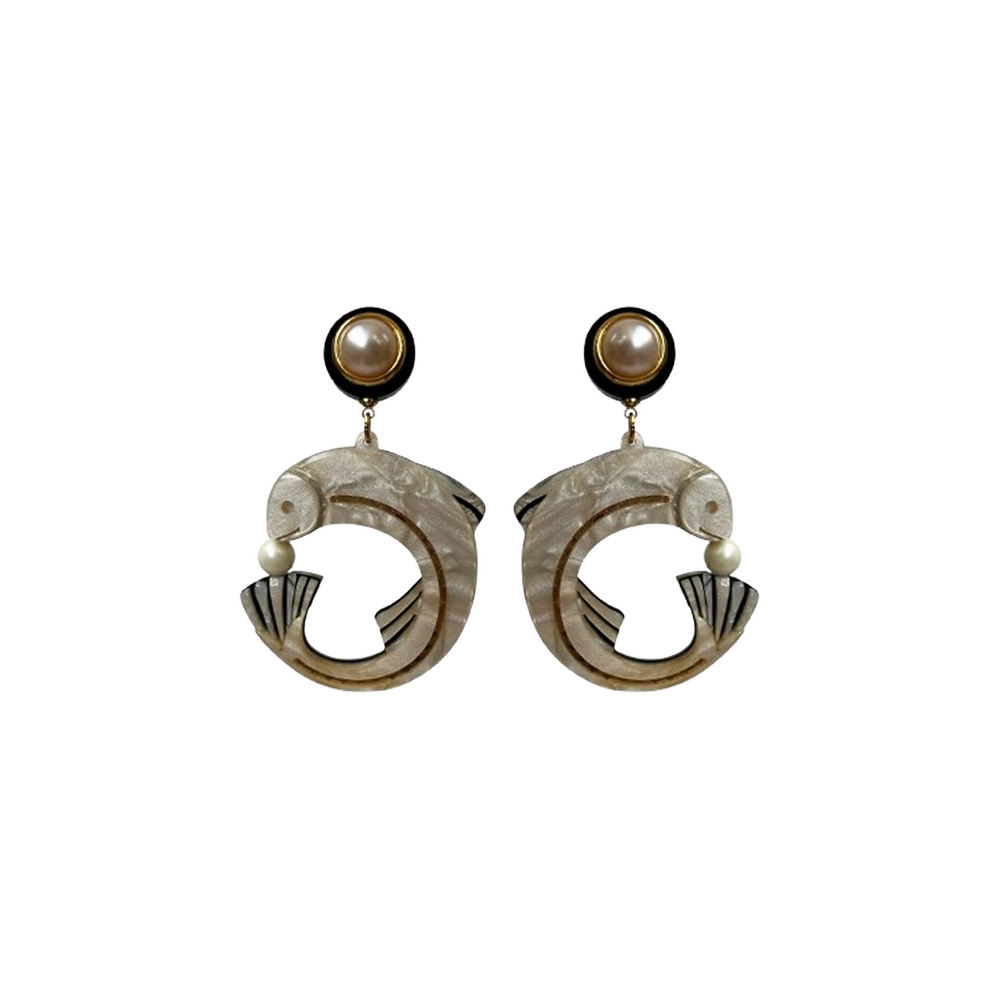 Brinco feito de acrílico, modelo articulado, com pérola shell, com aplicação de corrente, pino de brinco e metais com acabamento dourado. Feito a mão por artesãos brasileiros.