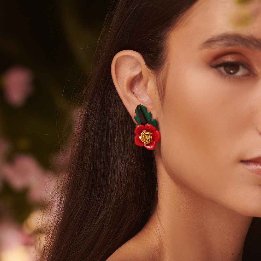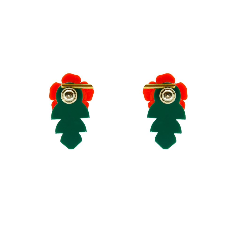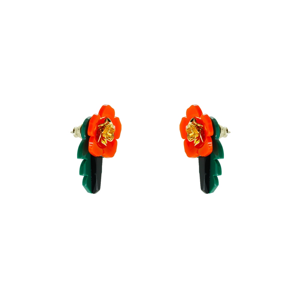 Brinco de acrílico, modelo curto, com aplicação em metal com acabamento dourado. Feito à mão por artesãos brasileiros.