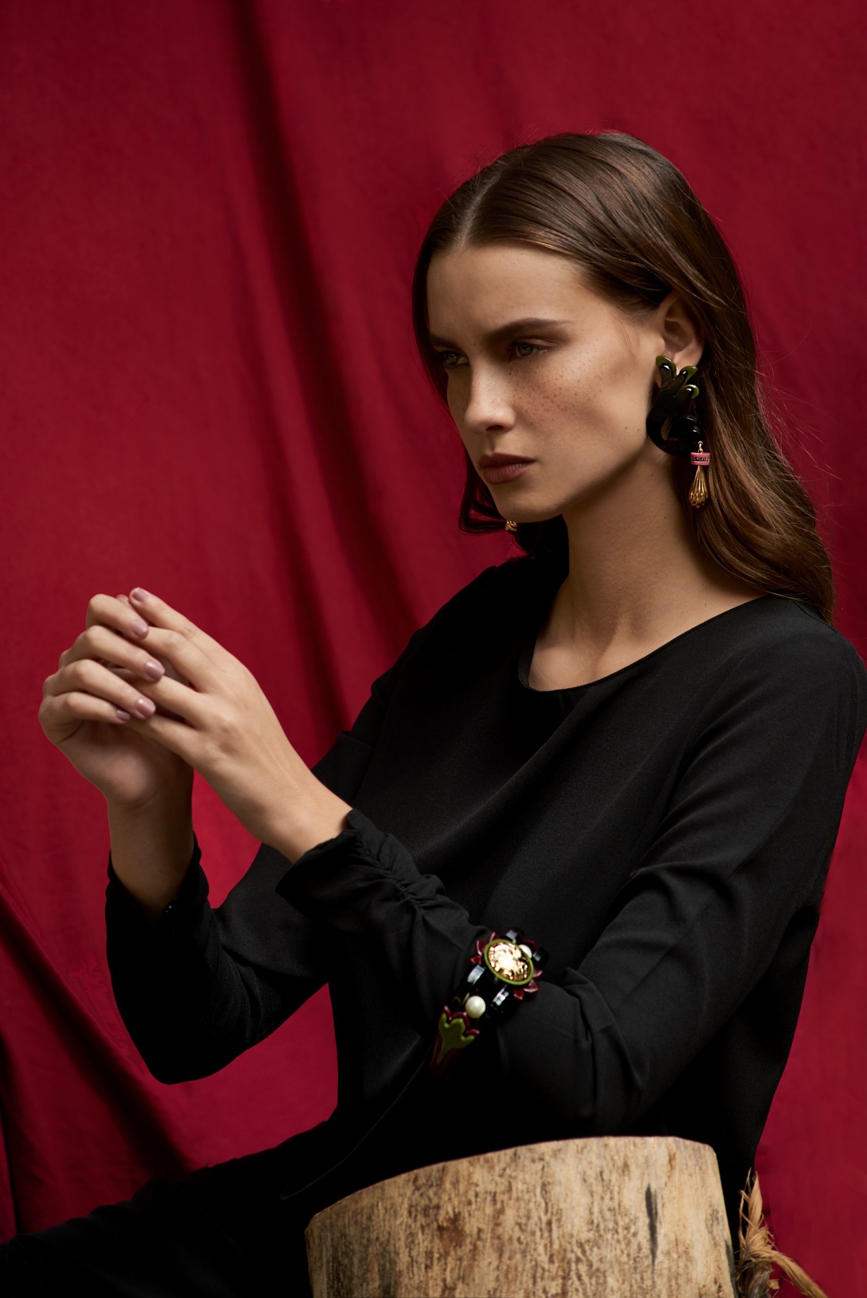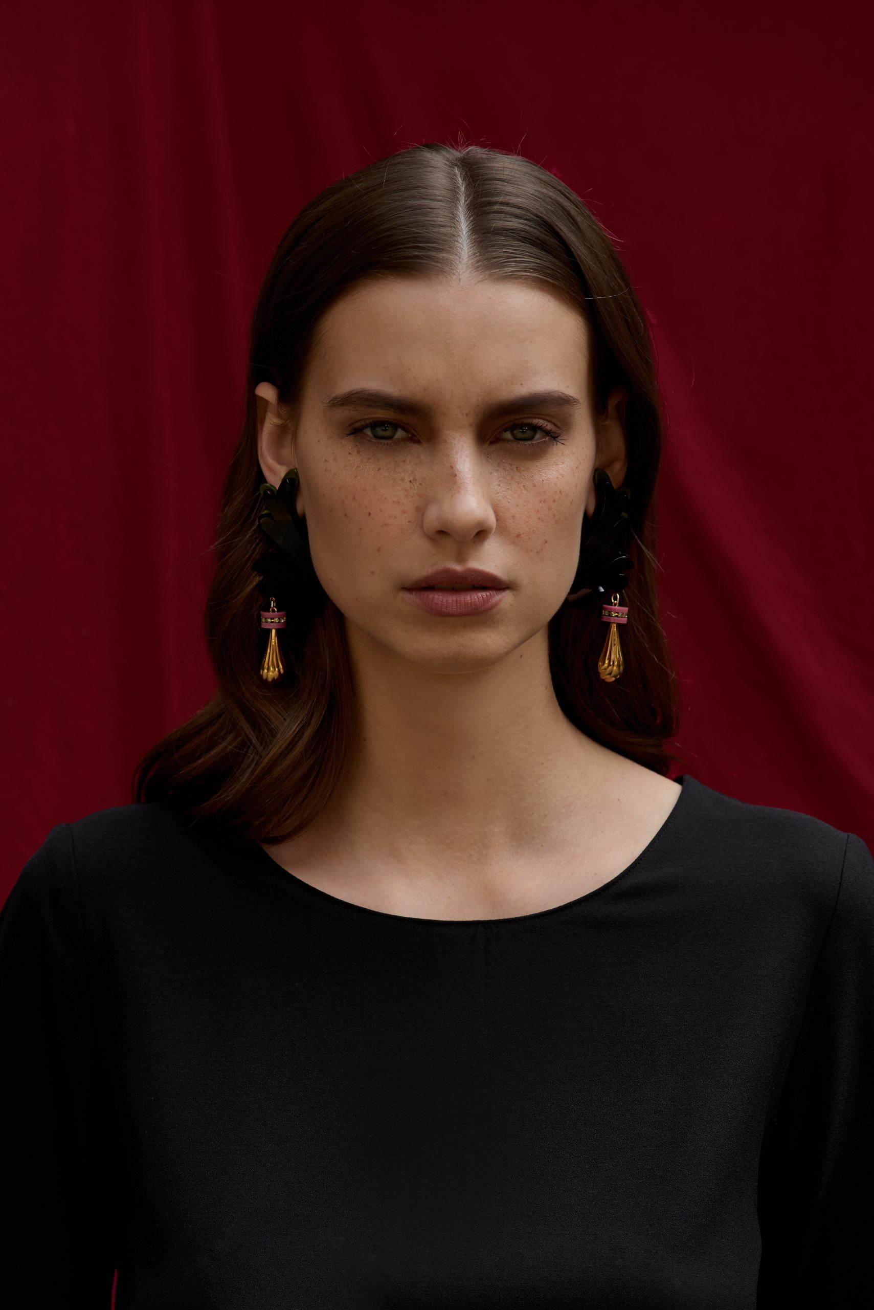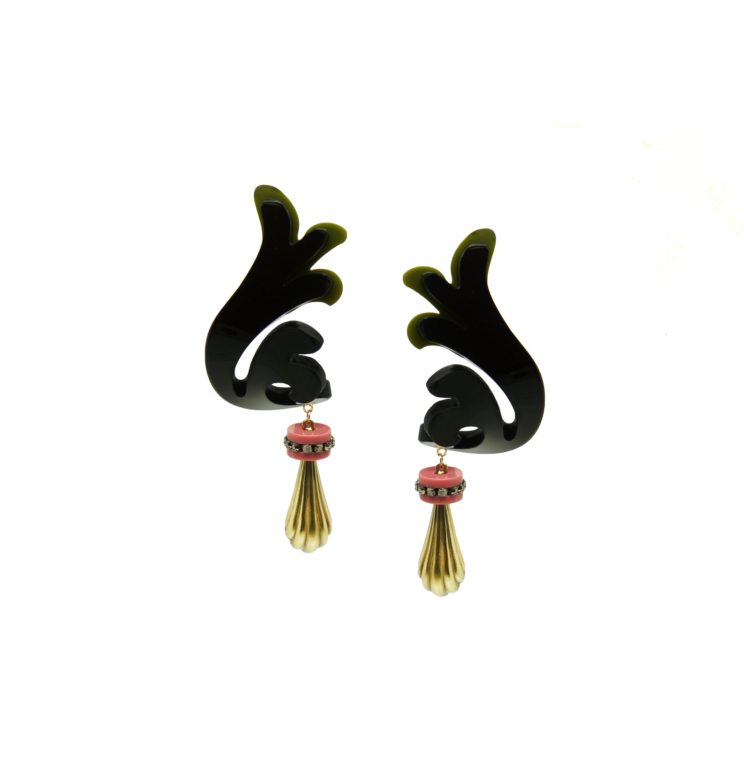 Brinco feito de acrílico, com aplicação de strass de vidro, peças em Zamak, com acabamento dourado, pino de brinco em aço inox. Feito a mão por artesãos brasileiros.