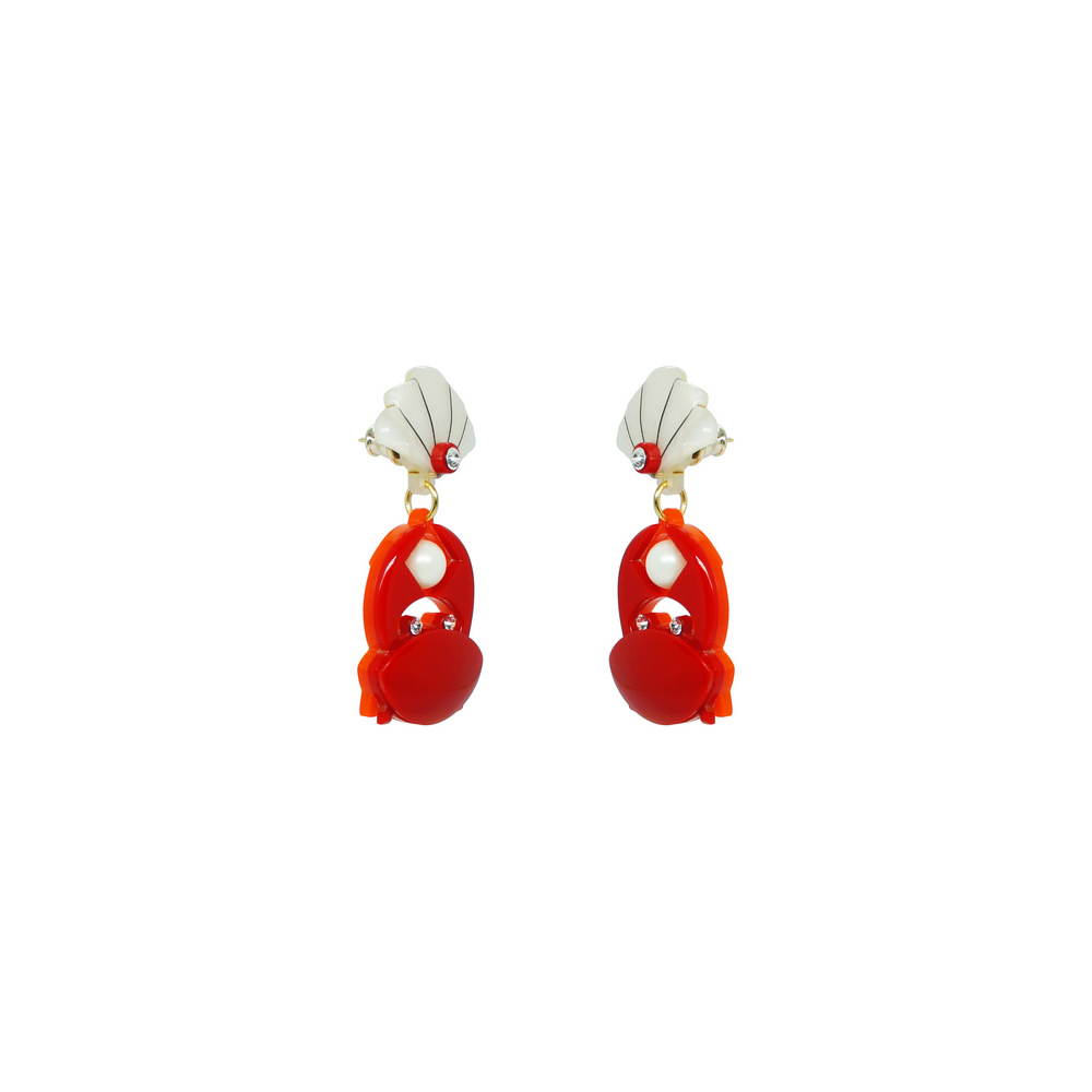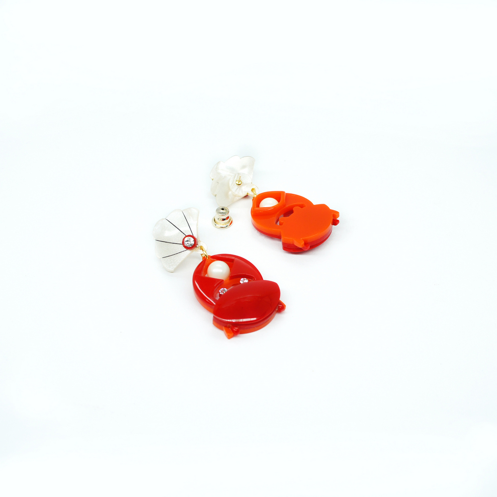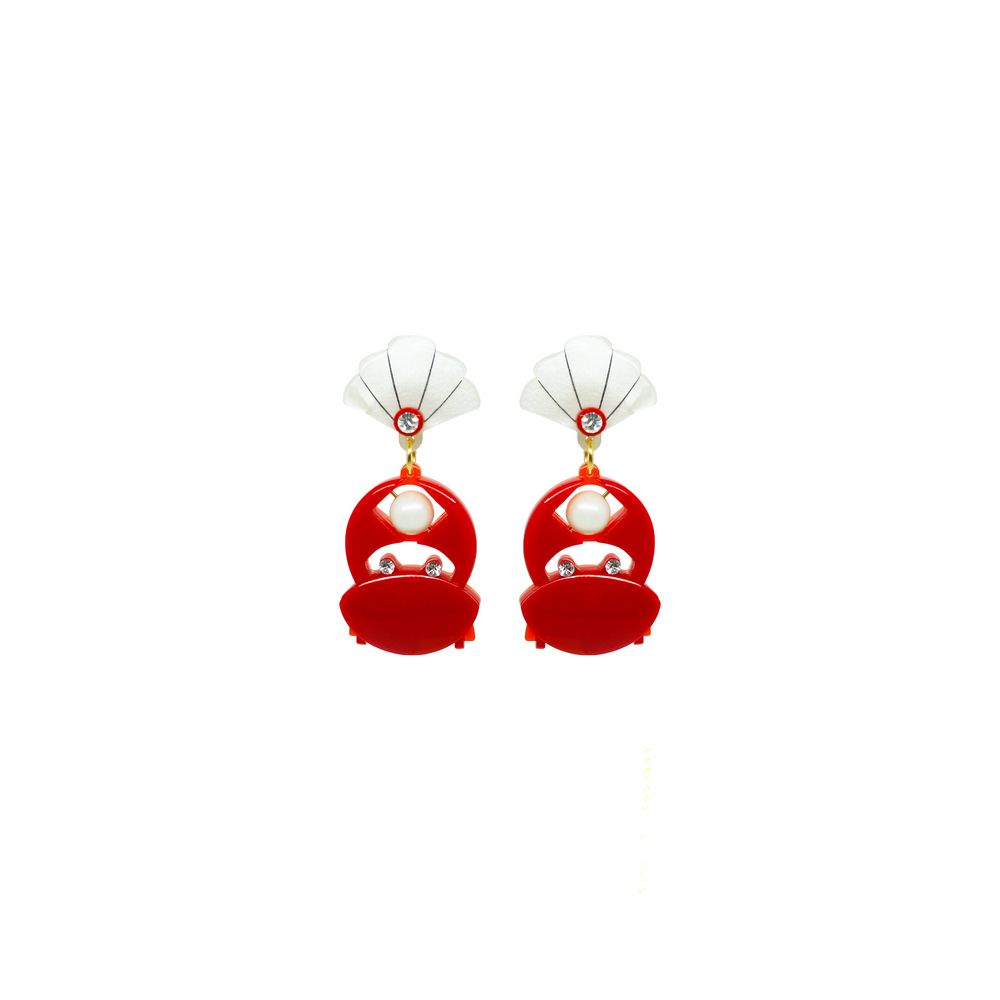 Brinco feito de acrílico, com aplicação de strass de vidro, com pérola shell, metais com acabamento dourado. Feito a mão por artesãos brasileiros.